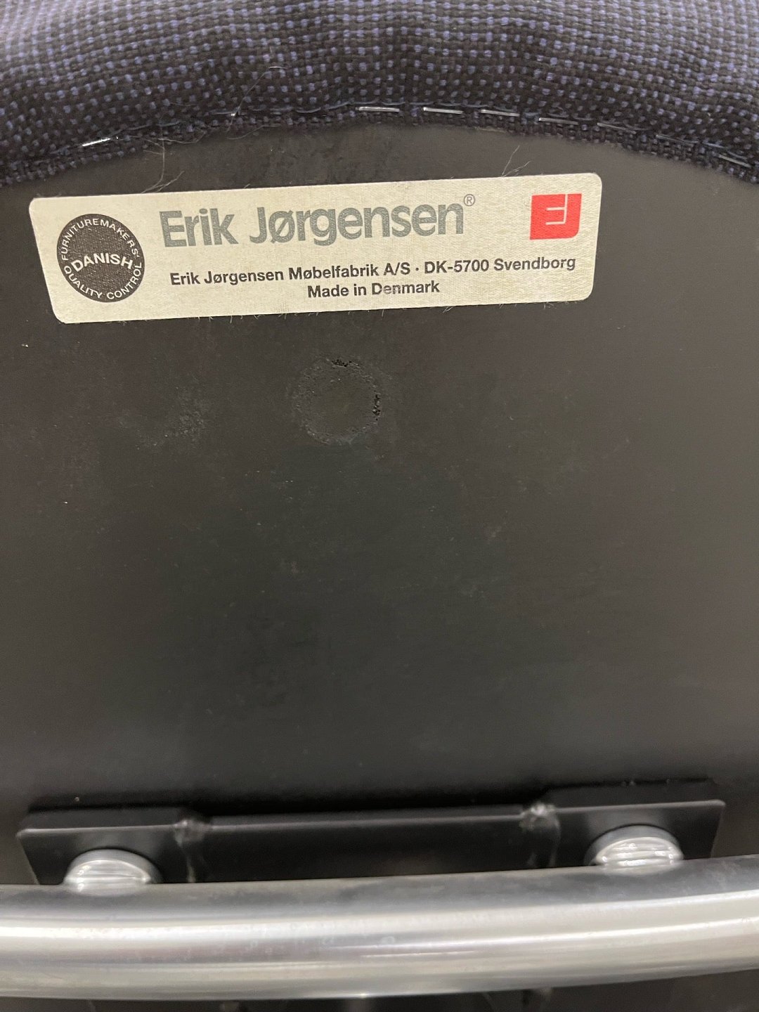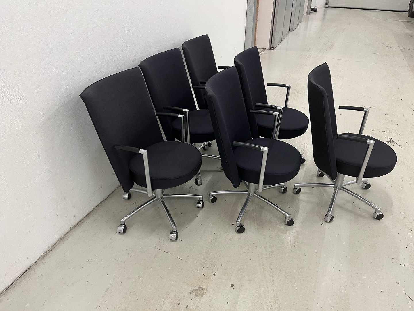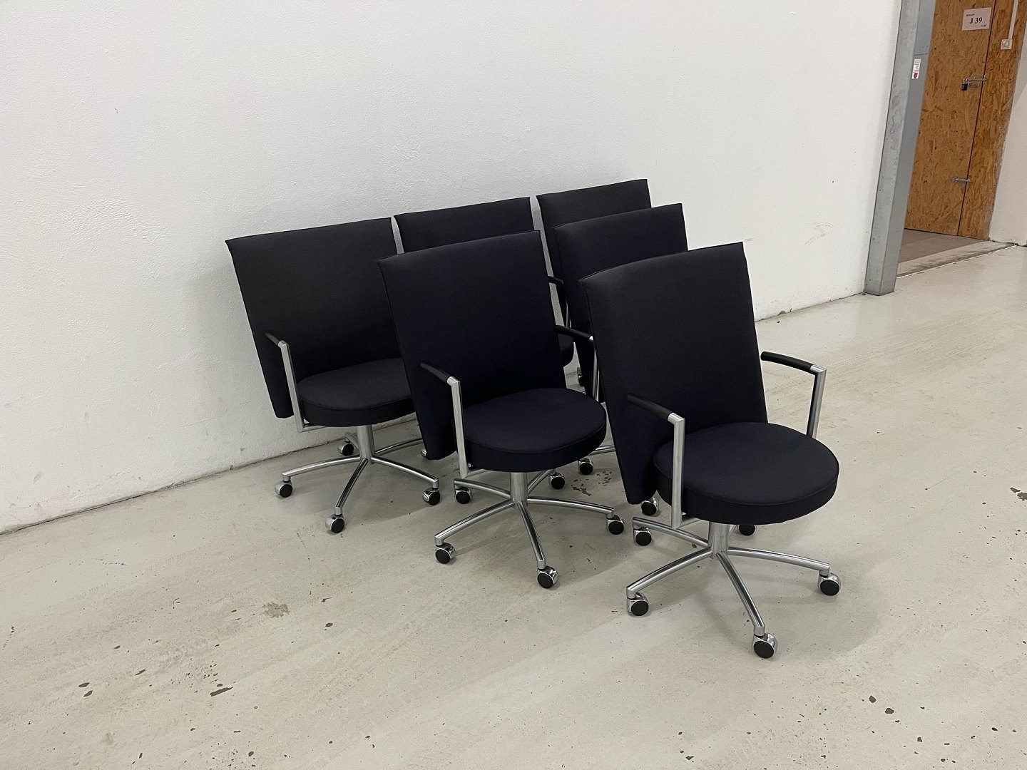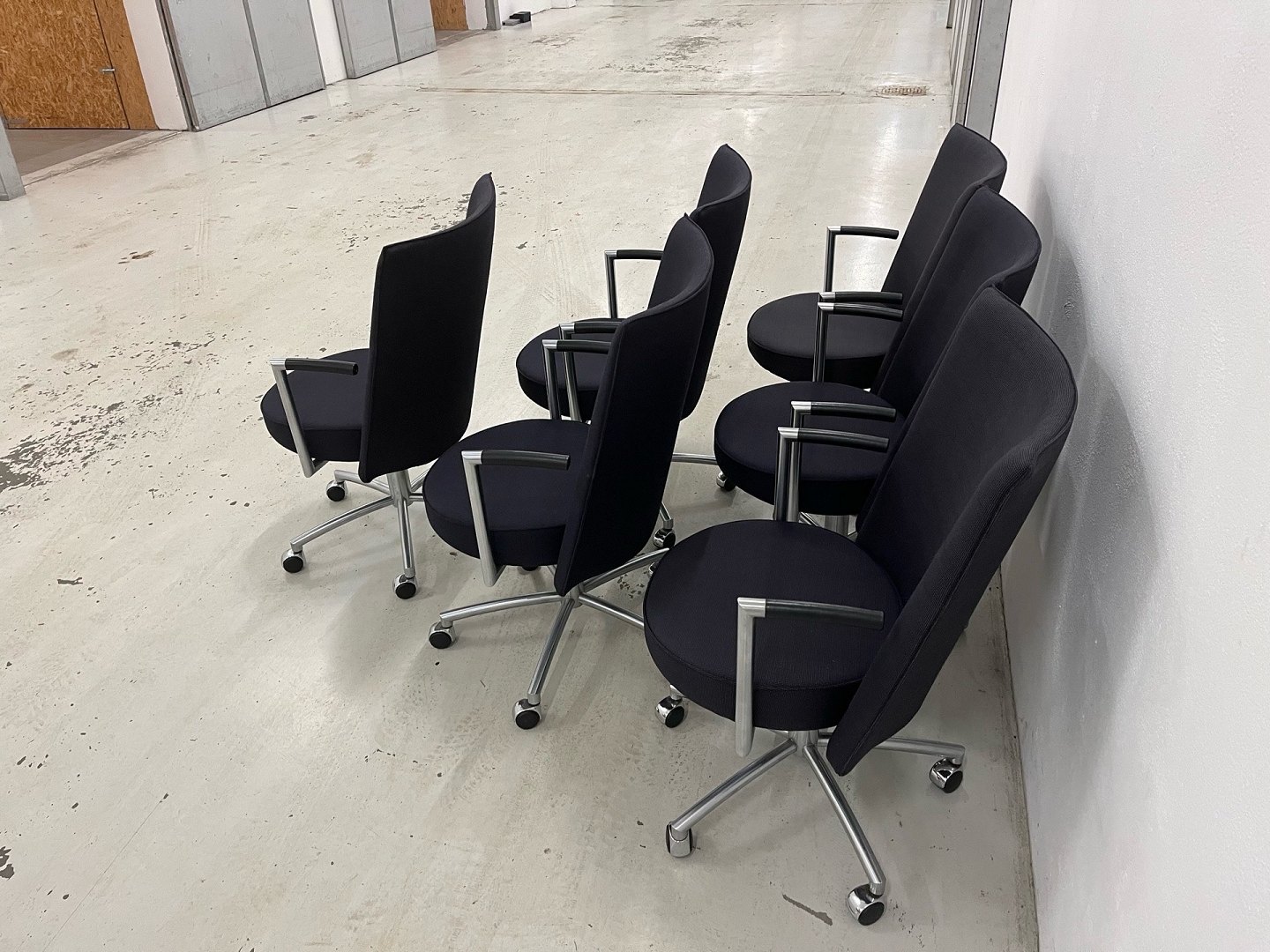 Stolene er udført i sort/blåt fastpolstret stof med stel i matforkromet stål. Oprindelig nypris pr. stol: DKK 18.995,-