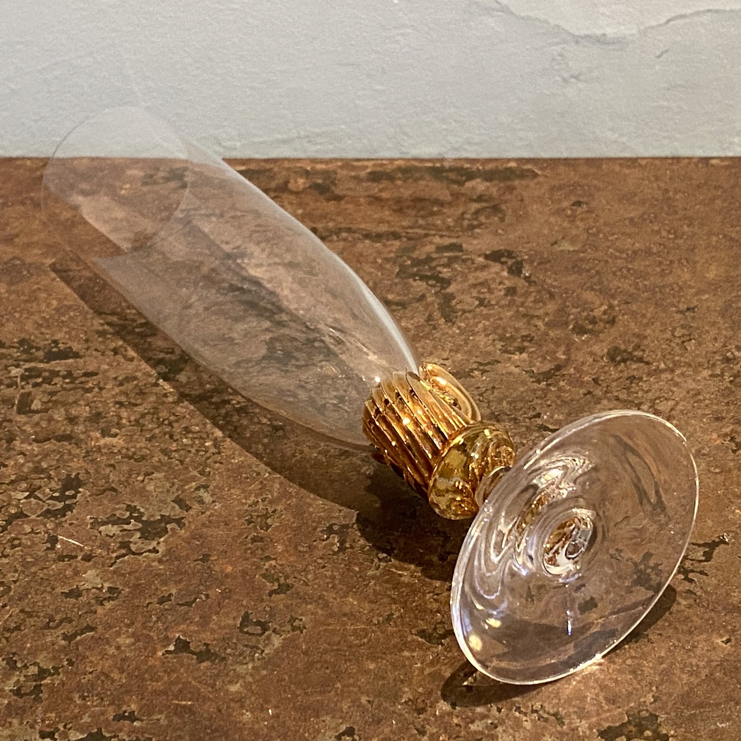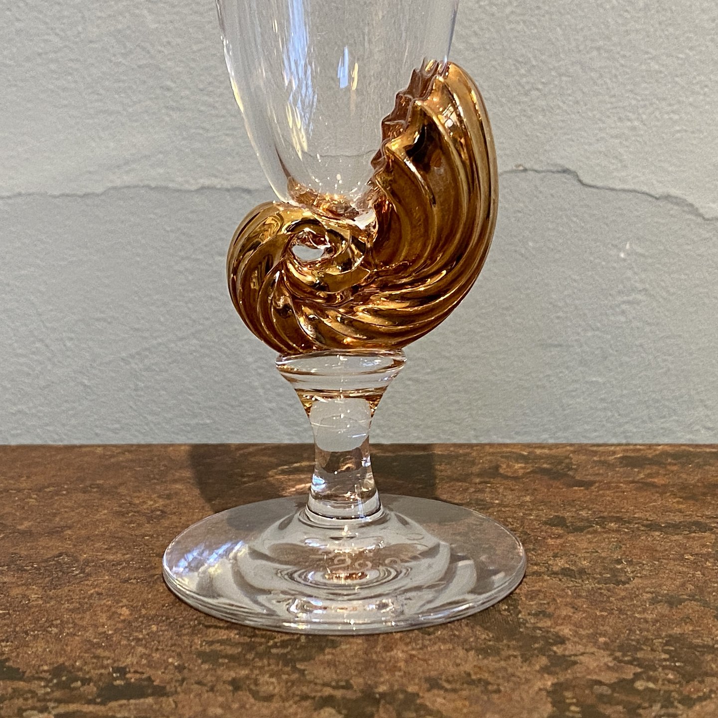 Designet af Darryle Hinz. Fremstillet af klart glas med en forgyldt dekorativ stilk i form af konkylie.