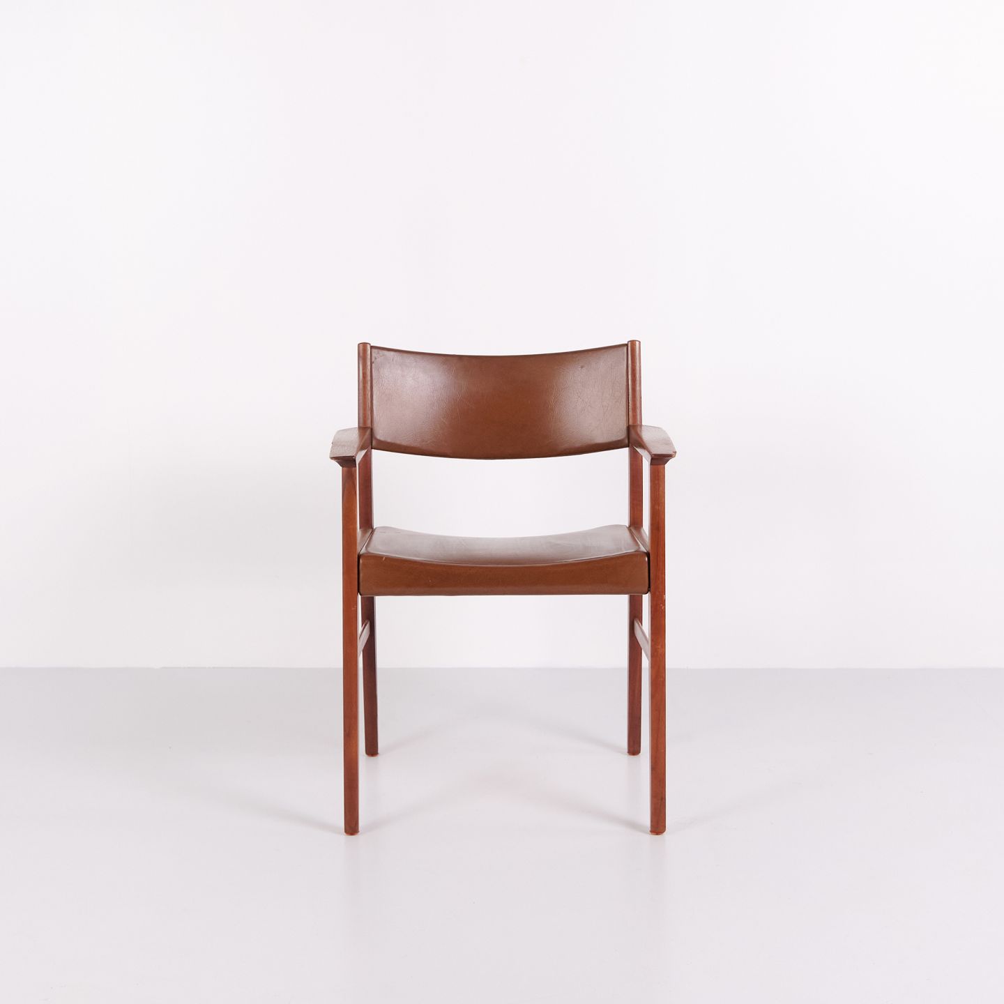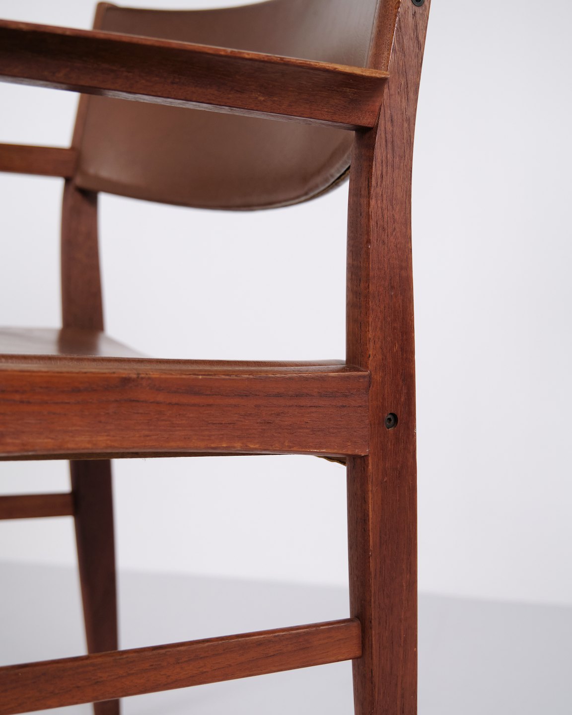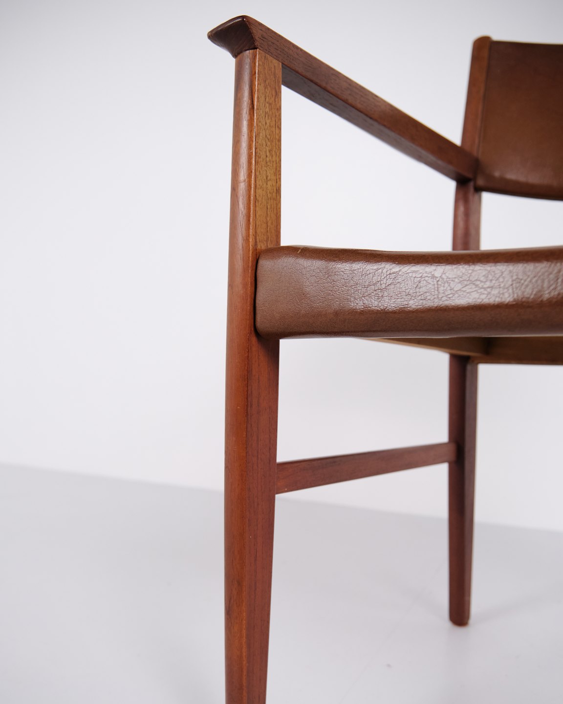 Armstol udført i teaktræ med sæde og ryg betrukket med brunt læder. Stolen er et typisk eksempel på dansk møbeldesign fra 1960’erne, hvor fokus var på funktion, solide materialer og håndværksmæssig kvalitet. Teaktræets varme tone kombineret med læderpolstringen gør stolen velegnet som spisebordsstol, skrivebordsstol eller fritstående armstol.