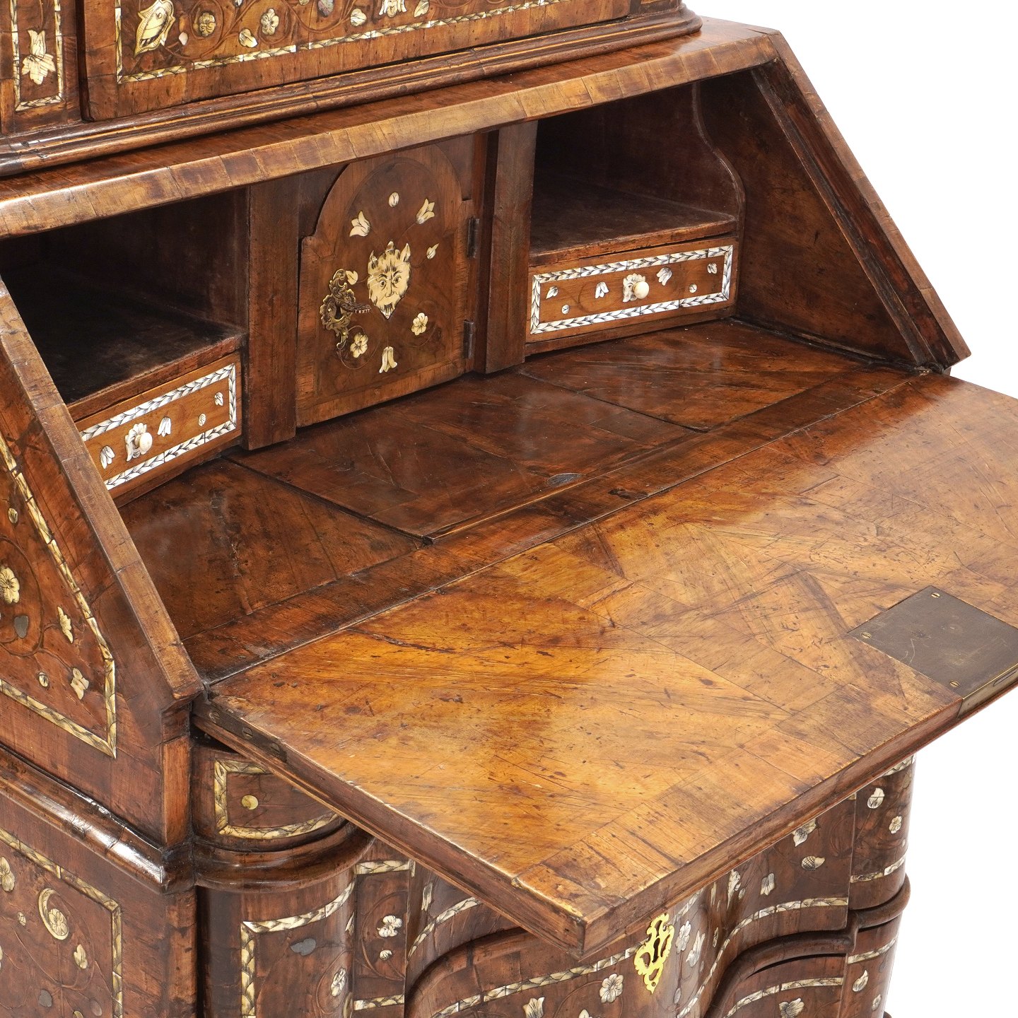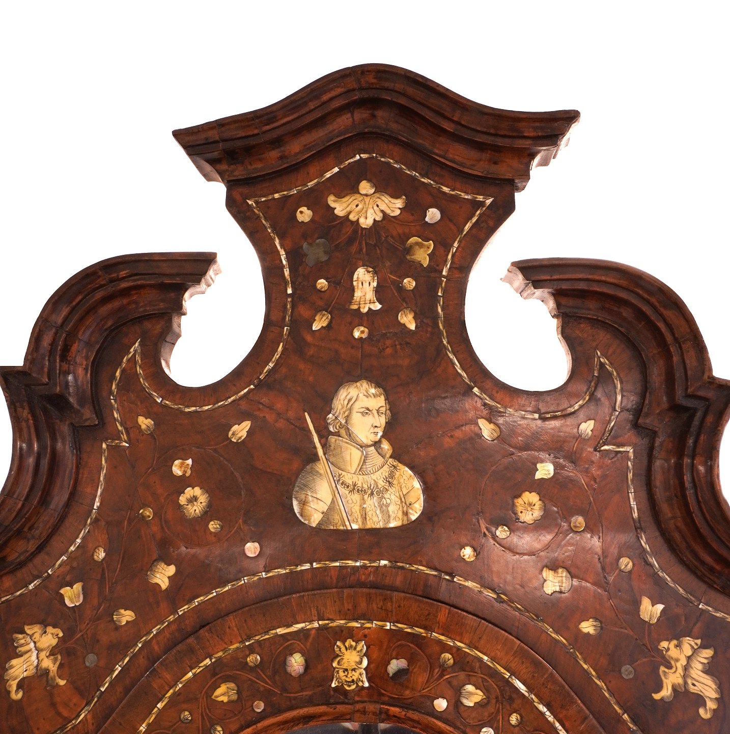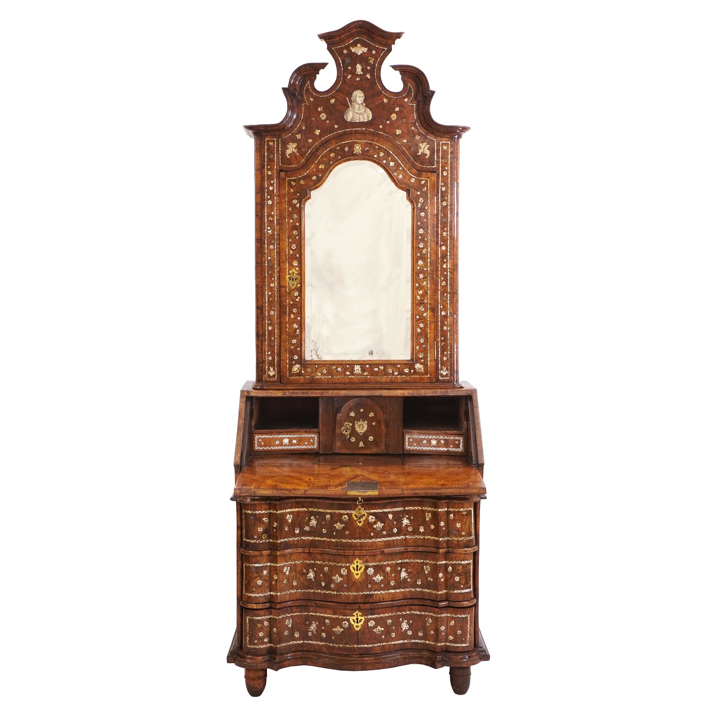 Venetiansk barokt pragtchatol i nøddetræ med talrige indlægningsarbejder. Overskab med spejl. Italien ca. år 1740. H: 235cm. B: 88cm. D: 78cm