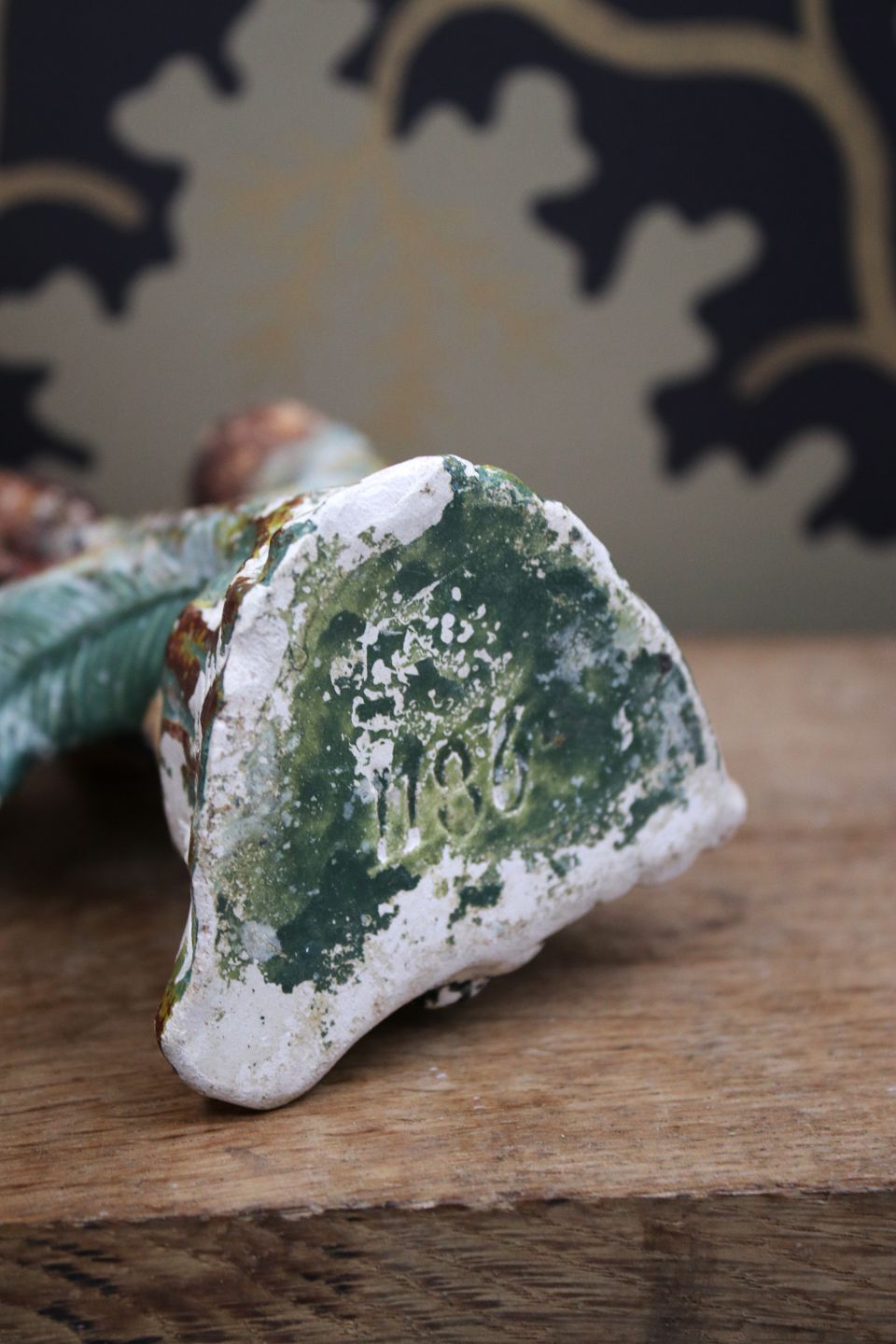 Gammel julestage i form af julenisse i bemalet gips siddende på træstub og bære 3 små julelys...