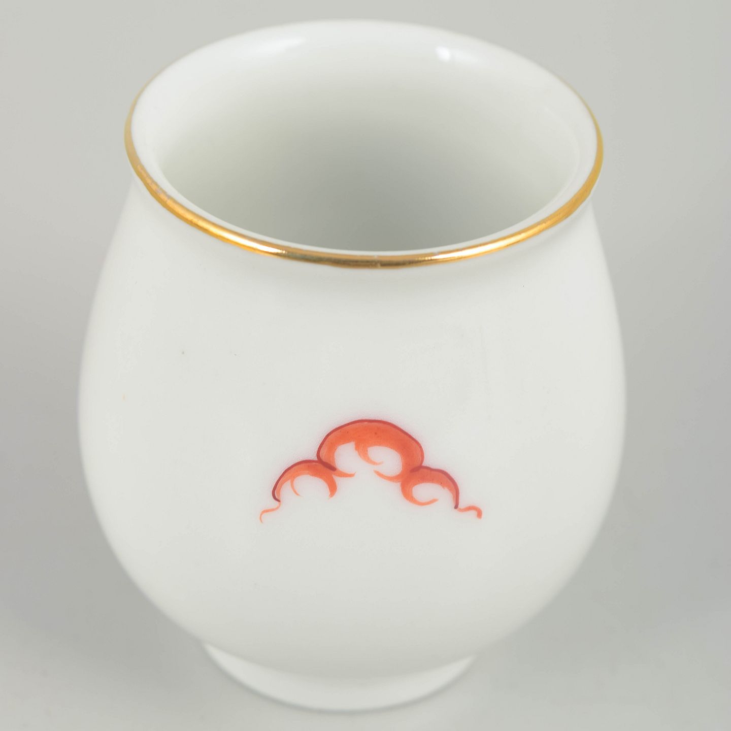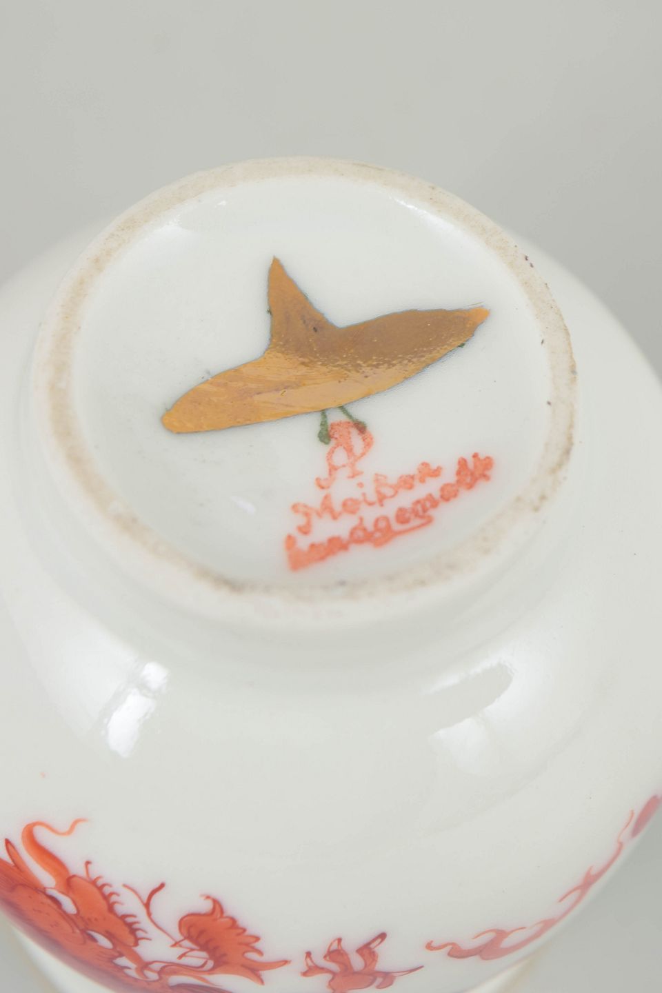 Lille balusterformet vase i hvidglaseret porcelæn dekoreret med rød Mingdrage og forgyldt kant. Modellen er mærket under bunden og er produceret i Meissen-området, men ikke af den kongelige Meissen-manufaktur.