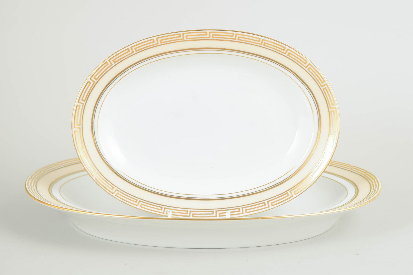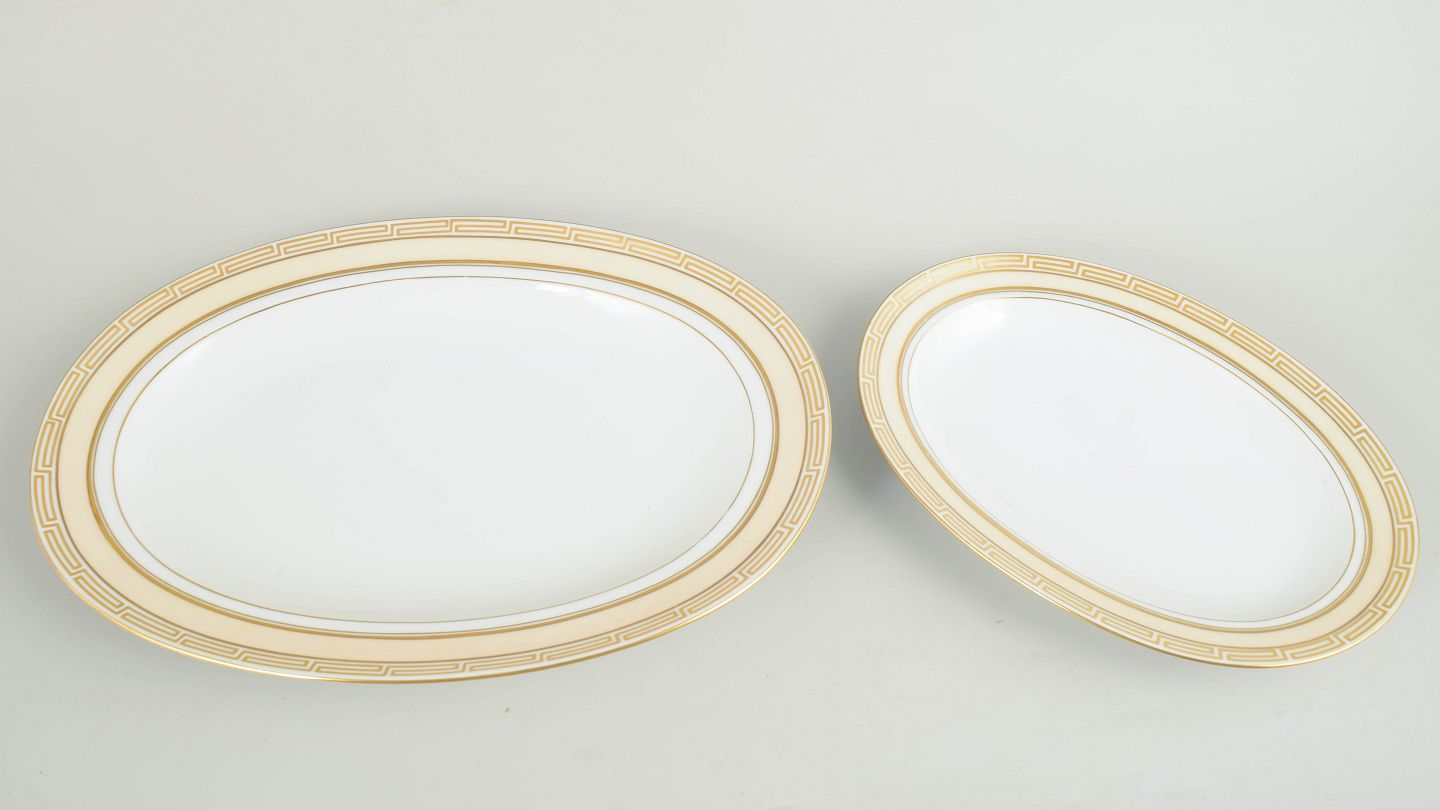 Sæt med to ovale serveringsfade i hvidglaseret porcelæn med forgyldt kant og geometrisk bort i art deco-stil; model 18 og 316.