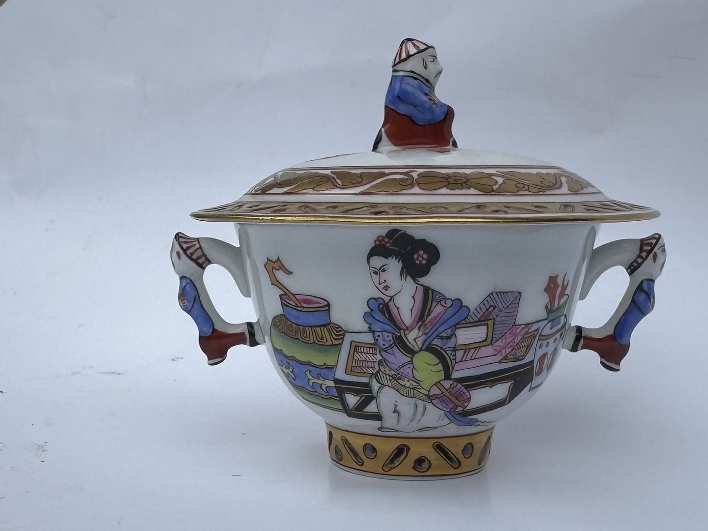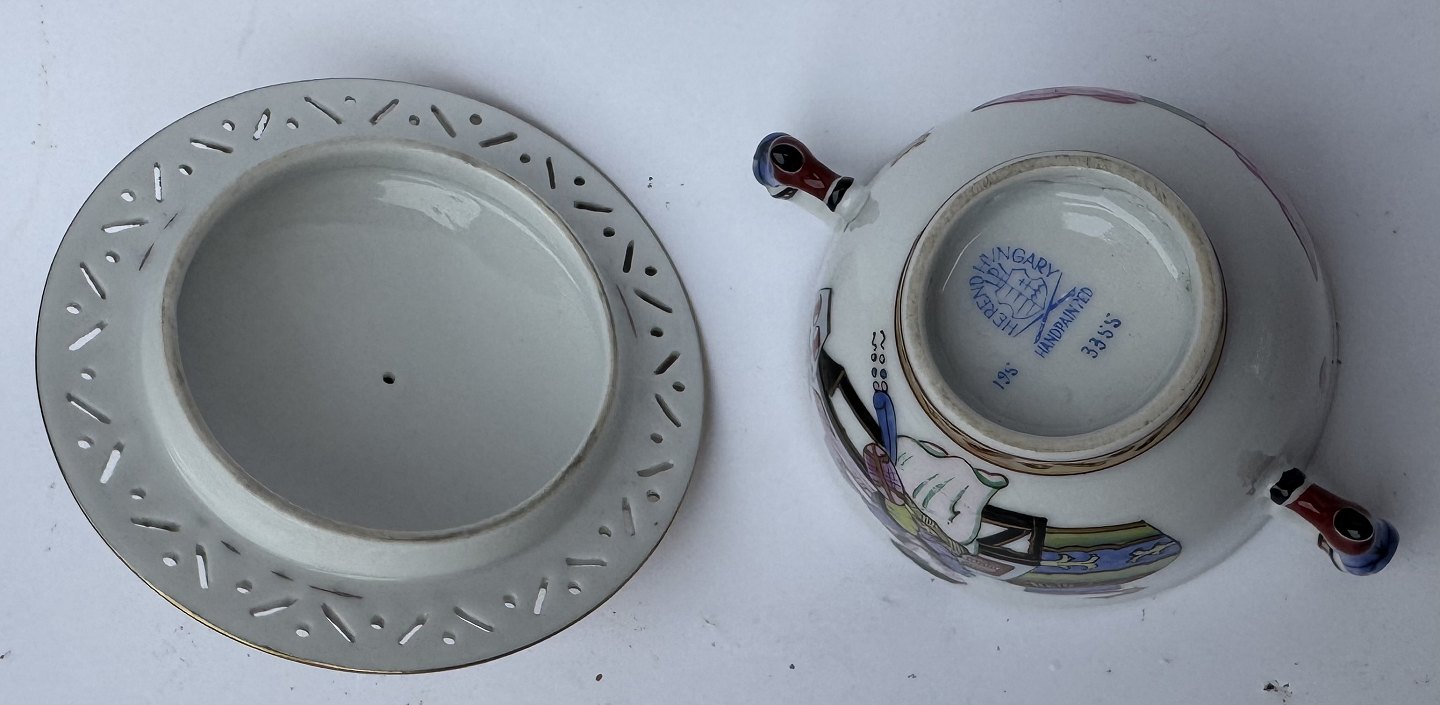 Herend lågskål i porcelæn fra Ming serien. Delikate kinesiske bemalede dekorationer samt figurer. Gennembrudte kanter. I perfekt stand. Fremstillet på den ungarnske porcelænsfabrik Herend i 1930’erne. Mål: H. 8,5 cm. Fra øre til øre 9,3 cm. Lågets diameter 8,6 cm. Bundens diameter 3,2 cm