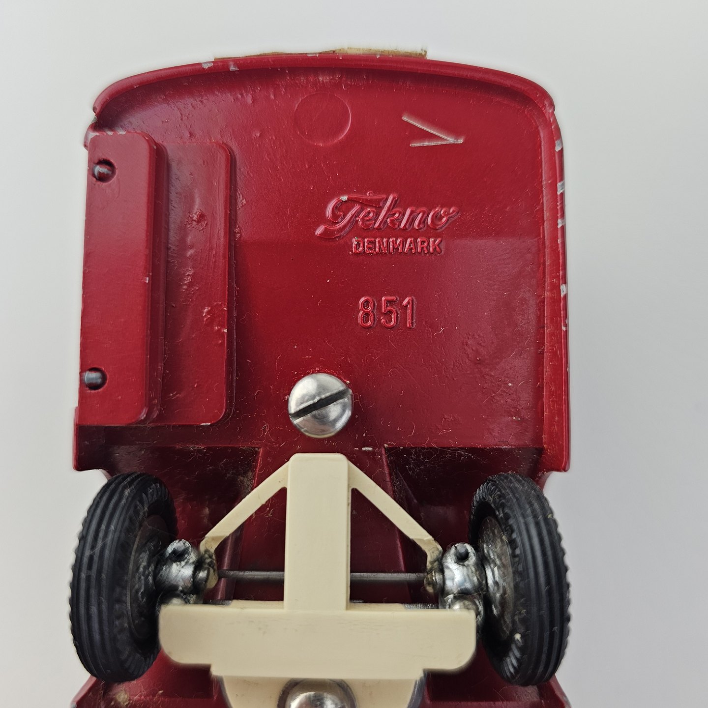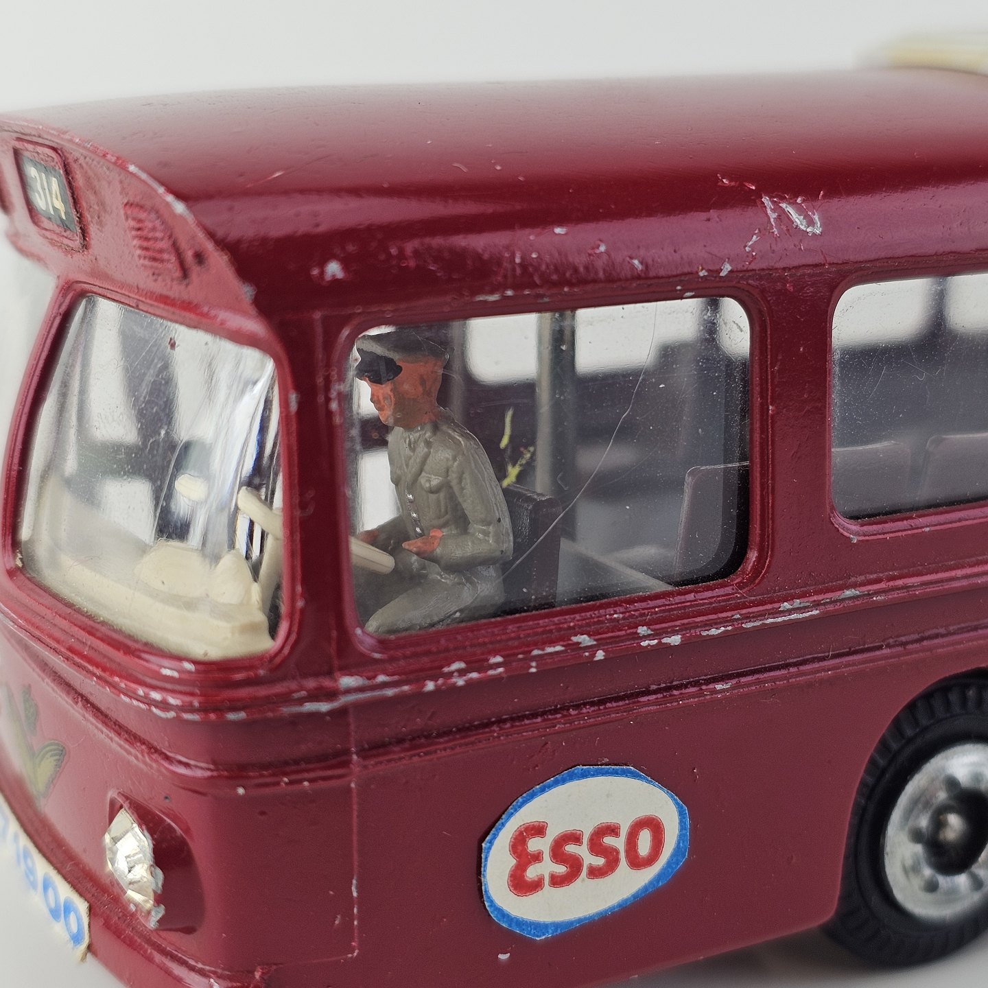 Legetøjsbil. Rødmalet DSB bus, Scania CR-76 med reklamer, chauffør og en baglåge, der kan åbnes