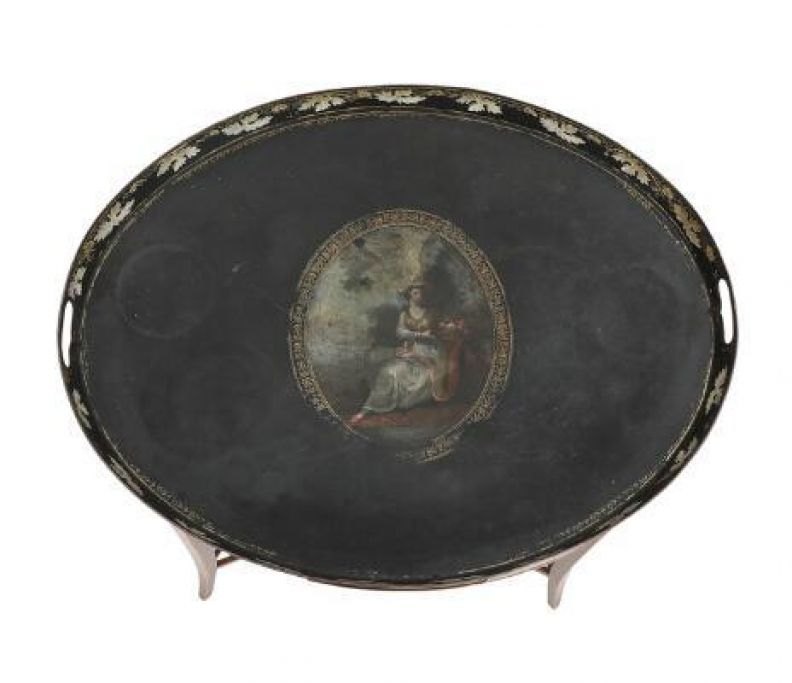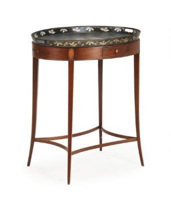 Ovalt Regency bakkebord af mahogni, ca. 1800, dekoreret med intarsia i form af konkylie, sarg med skuffe samt blindskuffe, sider med lysholdere, forsynet med bakke af sortmalet metal med motiv i form af siddende kvinde. H. 75 cm. B. 50 cm. L. 65,5 cm.