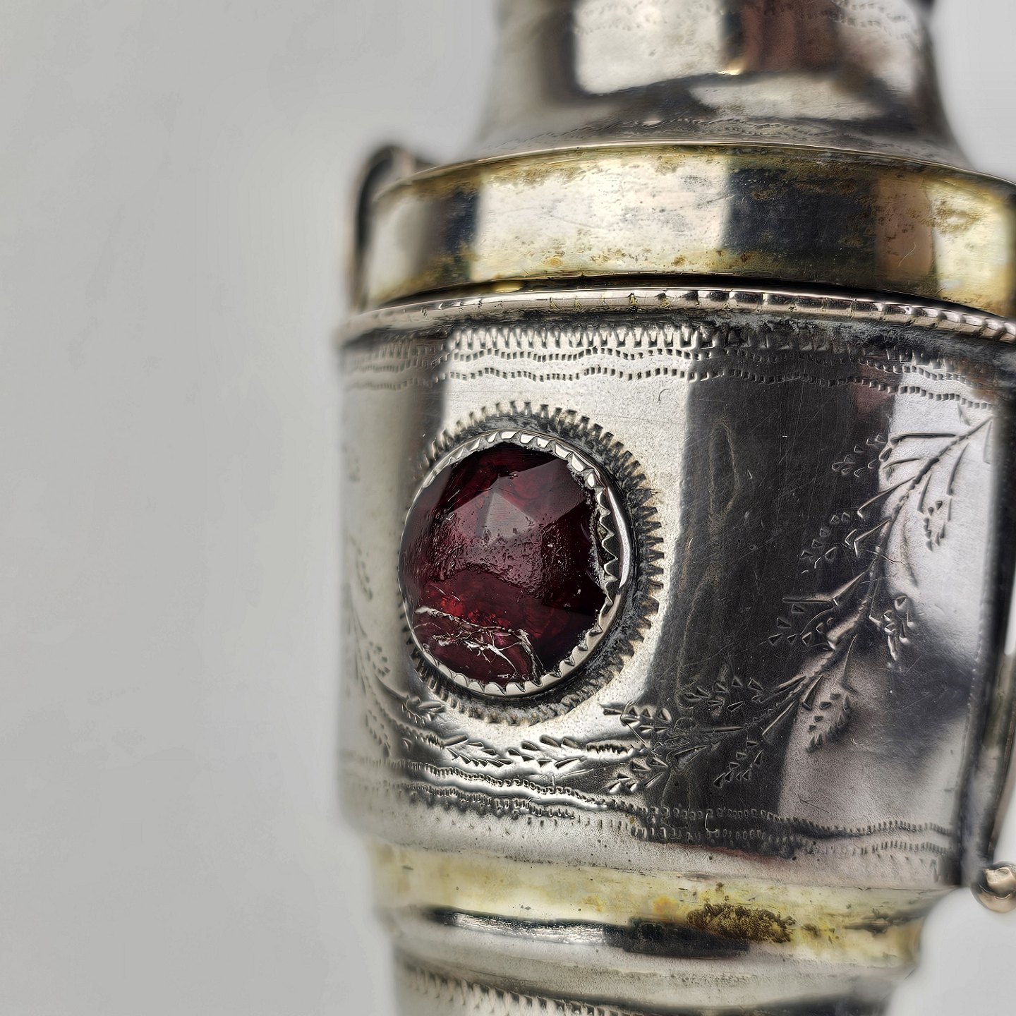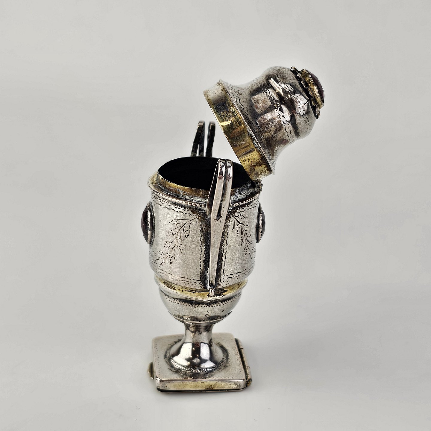 Hovedvandsæg i sølv dekoreret med forskellige smykkesten og bladværk