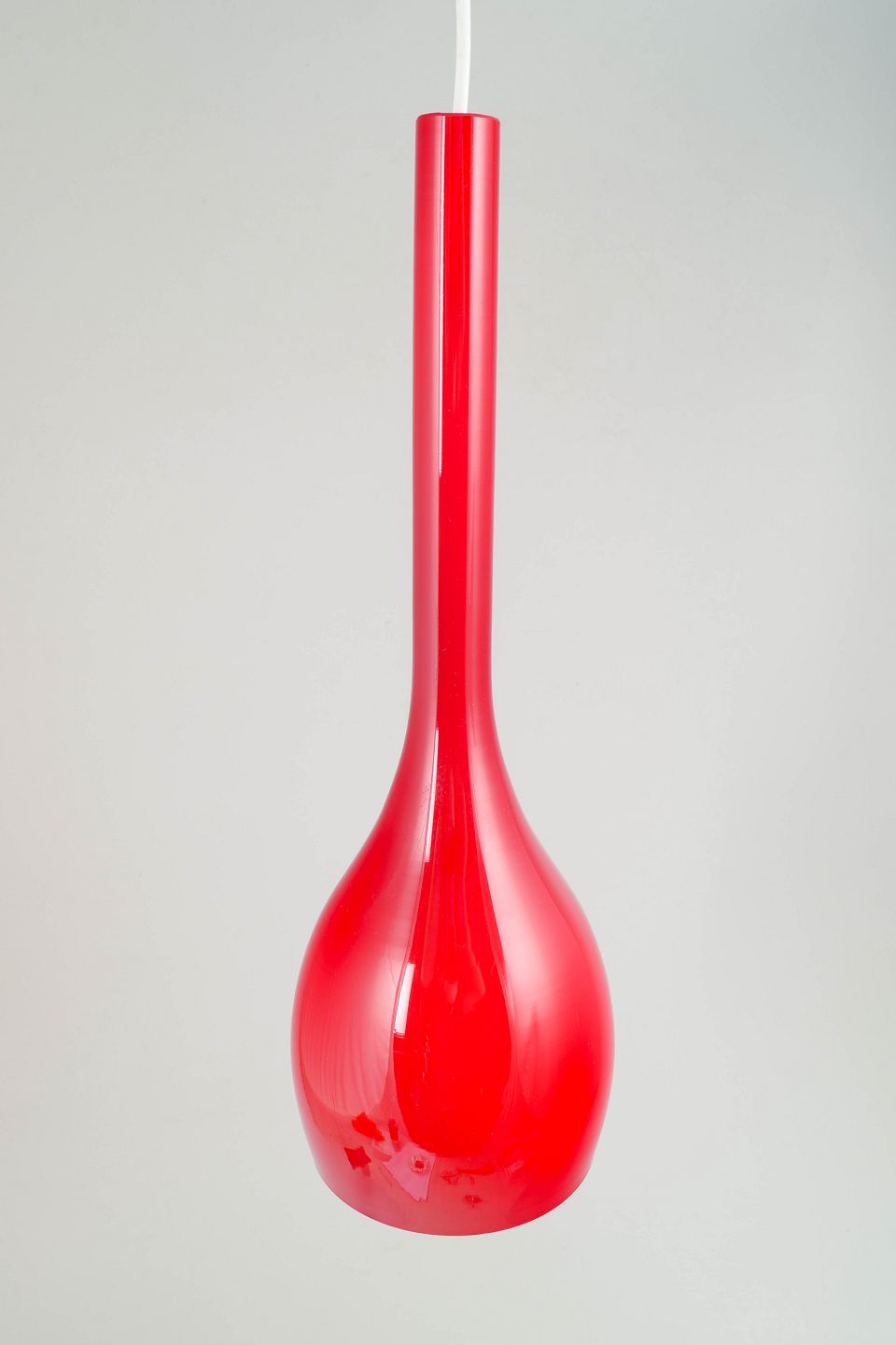 Drop-shaped pendant in glossy red art glass with a long, slender neck and a softly rounded body, made in mouth-blown glass.