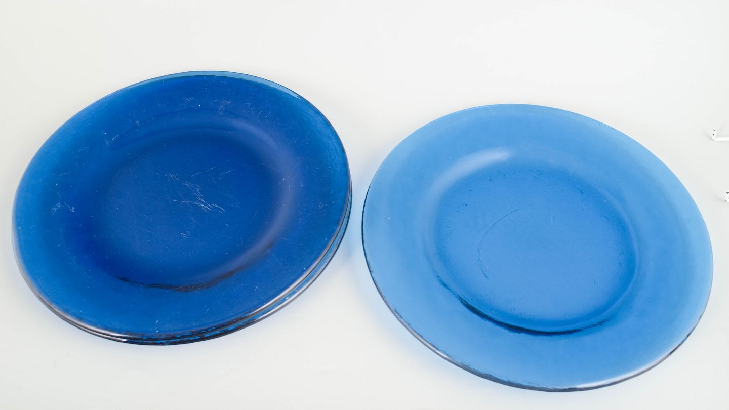 Sæt med tre svenske tallerkener i kraftigt blæst kunstglas i blå nuancer, udført med glat spejl og let ujævn rand, typisk for skandinavisk glasdesign fra midten af det 20. århundrede.