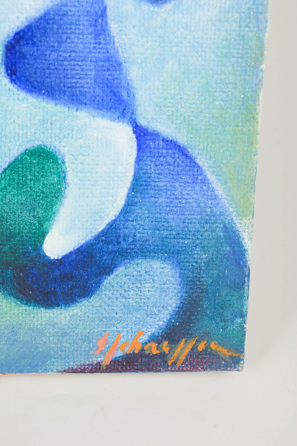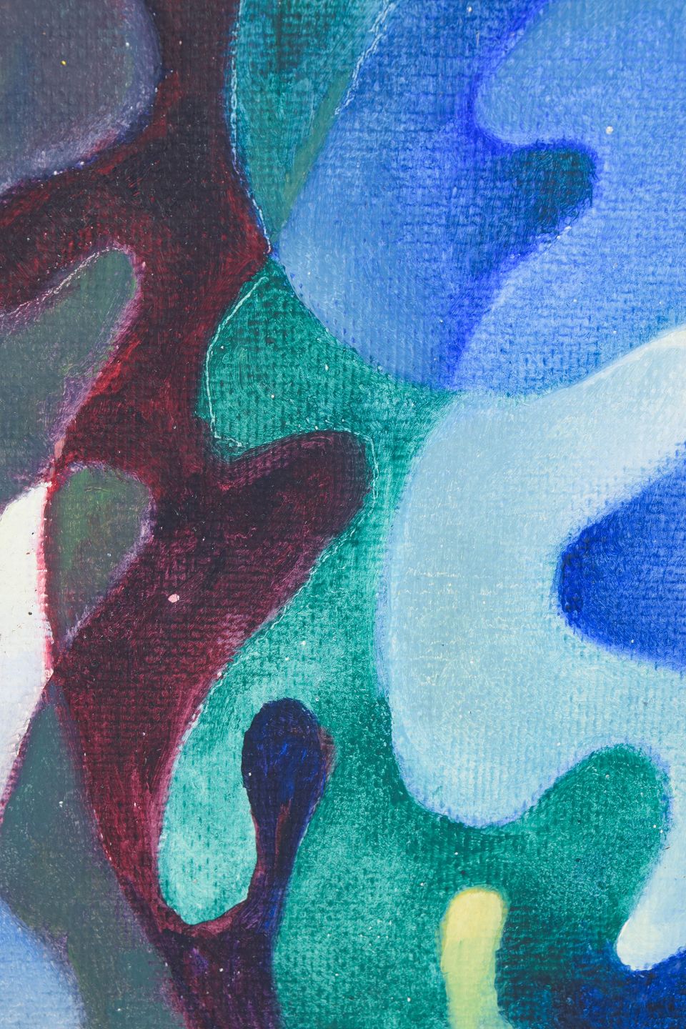 Abstrakt maleri med organiske, flydende former og overlappende farvefelter udført i olie på plade, signeret.