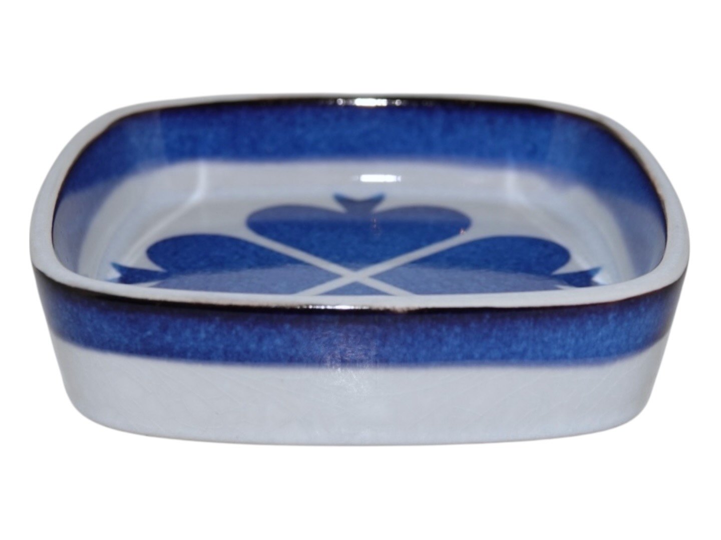 Royal Copenhagen Baca, lille blå firkantet skål med teksten bagpå: Den Frie Købmand er værd at gæste.