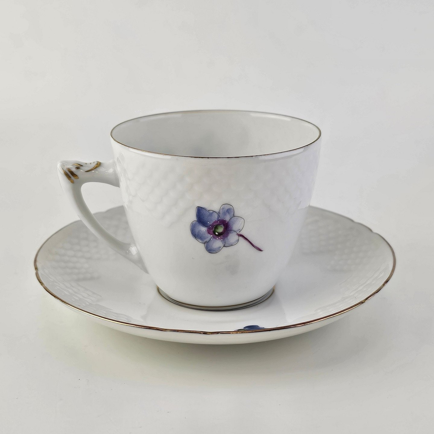Antonius er af hvidt porcelæn med skælform dekoreret med håndmalede blå anemoner og guldkant
