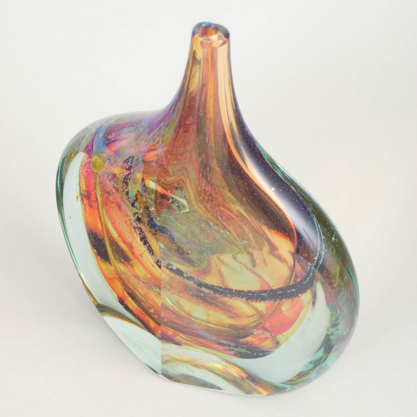 Organically shaped art glass vase in heavy, hand-blown glass with encapsulated swirling colours in amber, orange, and dark contrasting tones, finished with a clear outer layer. Freely formed asymmetric profile with pronounced weight in the base. Signed to the underside “Mdina glass, Malta”.