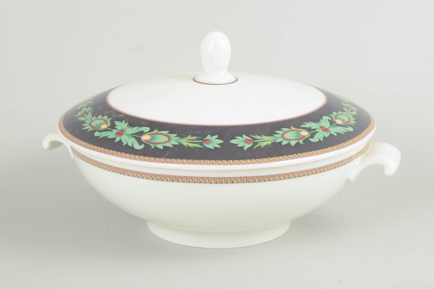 Terrin med låg i porcelæn fra Rosenthal Classic, dekoreret i serien Mayfair med mørk bort, stiliserede grønne bladranker og gulddetaljer, produceret i 1980’erne.