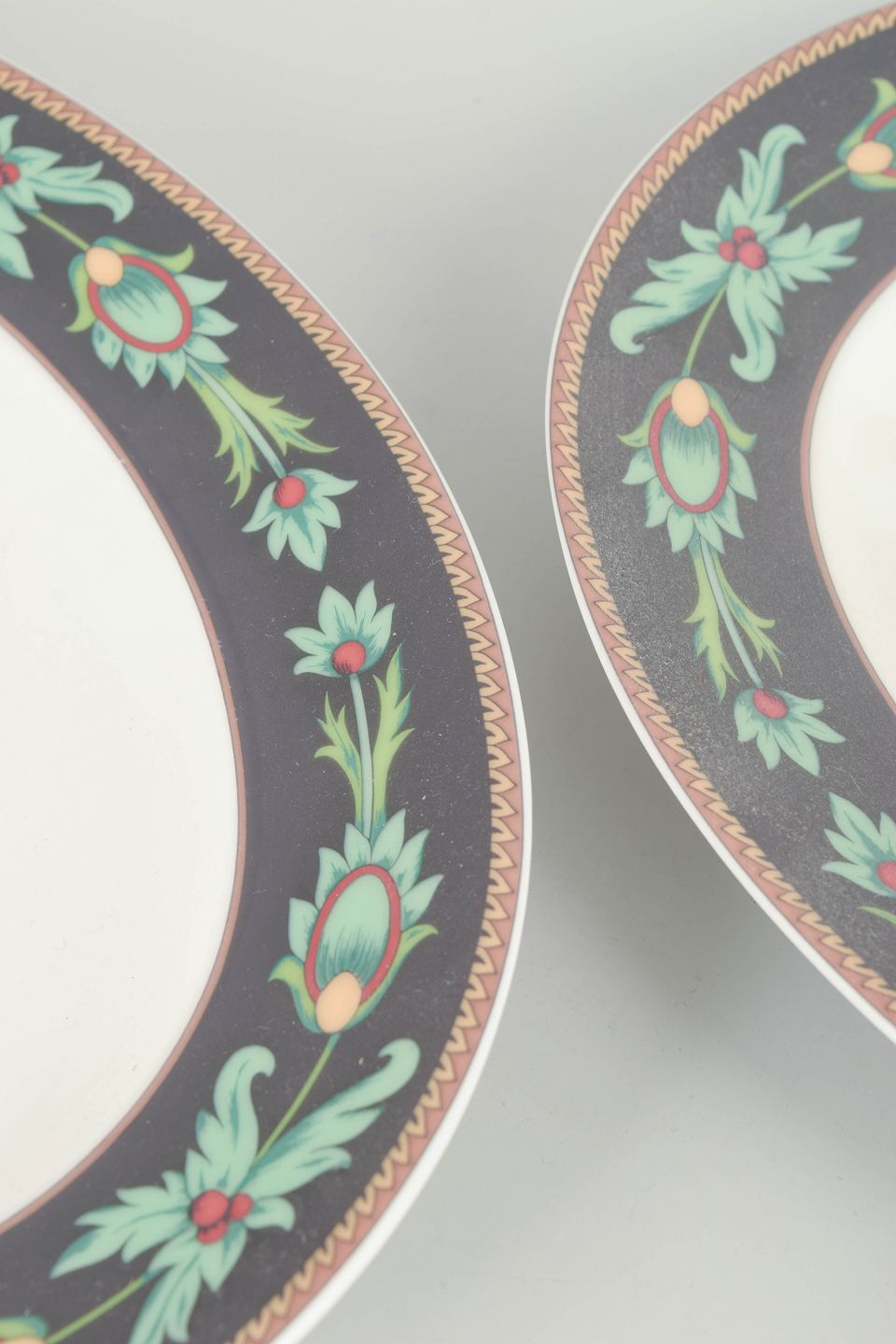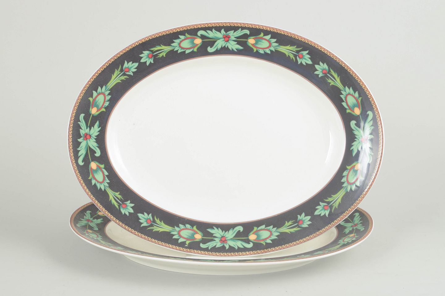 Sæt med to ovale fade i porcelæn fra Rosenthal Classic, dekoreret i serien Mayfair med mørk bort, stiliserede grønne bladranker og gulddetaljer, produceret i 1980’erne.