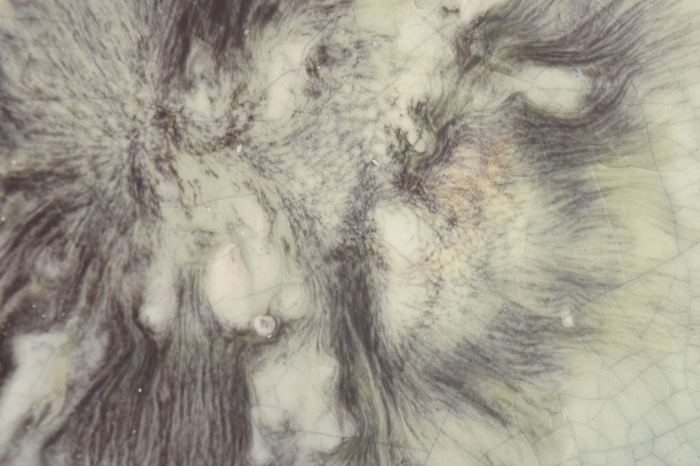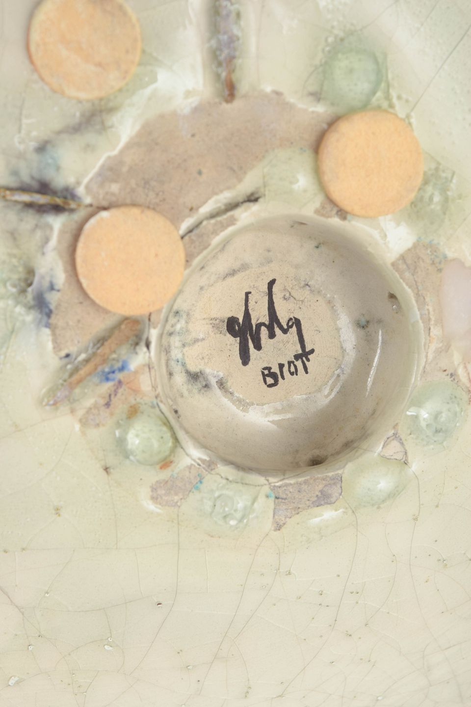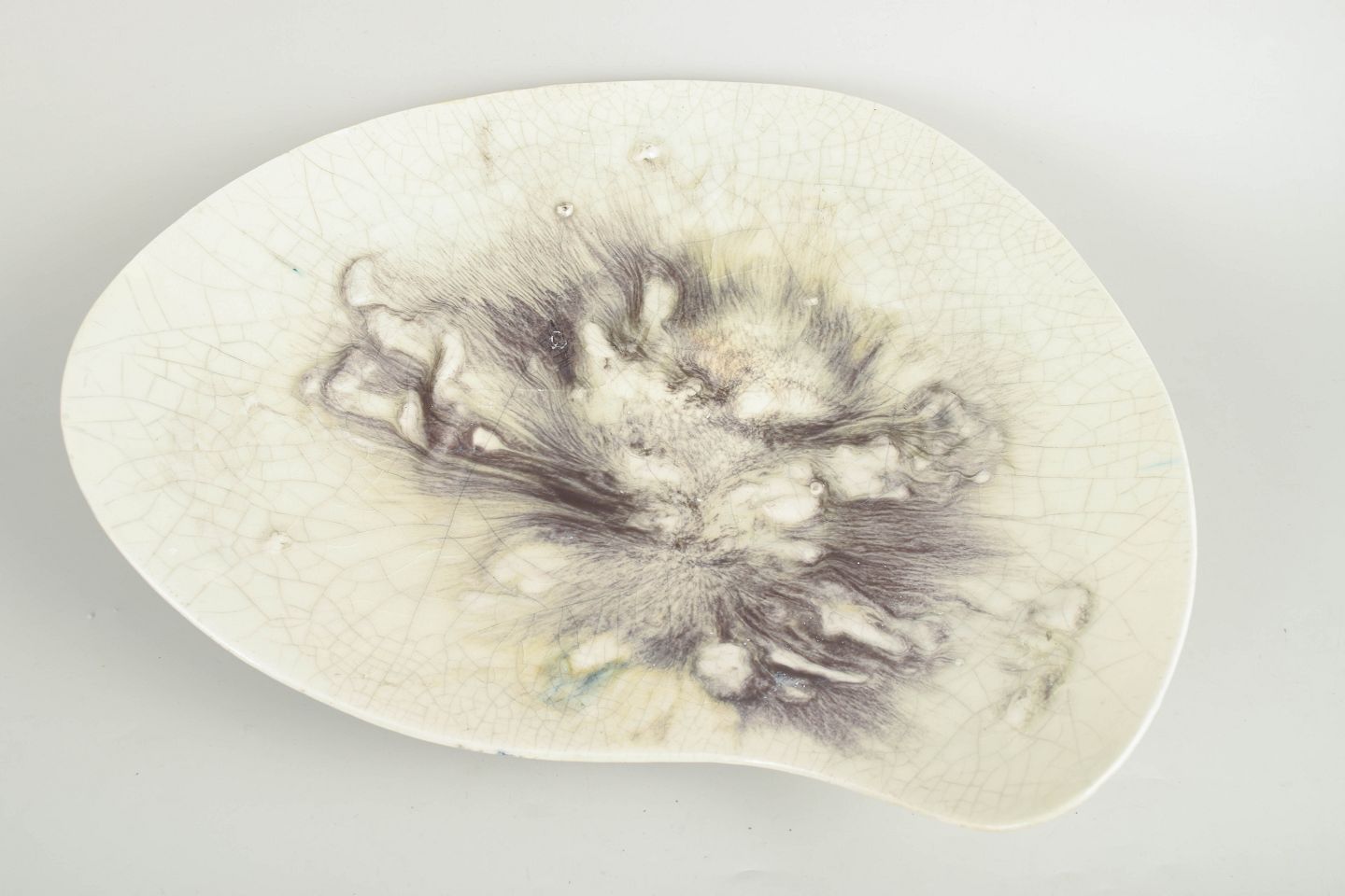 Organisk formet fad i stentøj med lys krakeleret glasur og central, malerisk dekoration i grå og violette nuancer. Modellen er kendetegnet ved en asymmetrisk, let bølgende form og fremstår signeret under bunden.