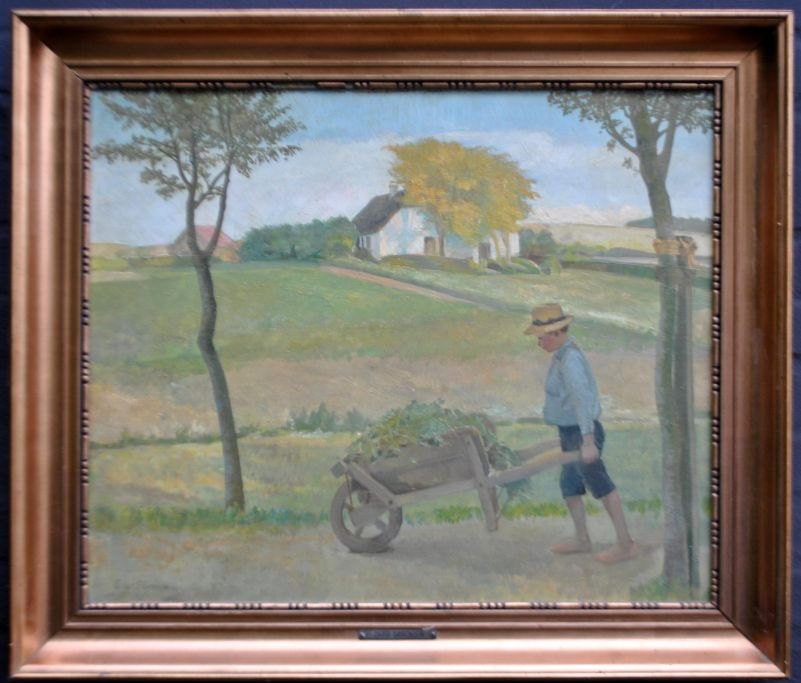 Sørensen, Eiler (1869 - 1953) Denmark: Boy with wheelbarrow. Oil on canvas. Signed: Eiler Sörensen. H: 52 cm. W: 65 cm.
