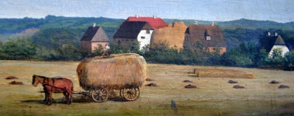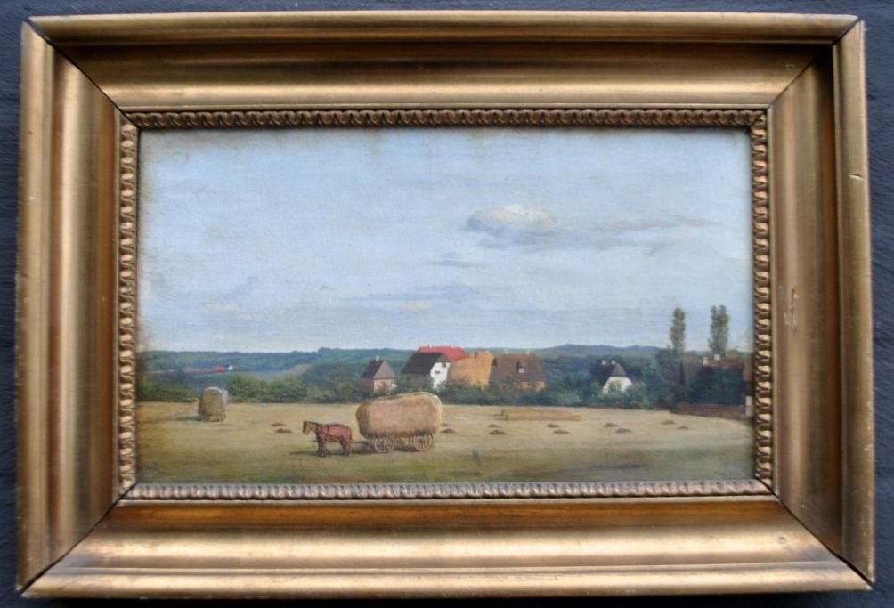 Rademacher, Niels Grønbek (1812 - 1885) Denmark: Harvest scene from a Zealand manor. Oil on canvas. Faintly signed. 19 x 32.5 cm.