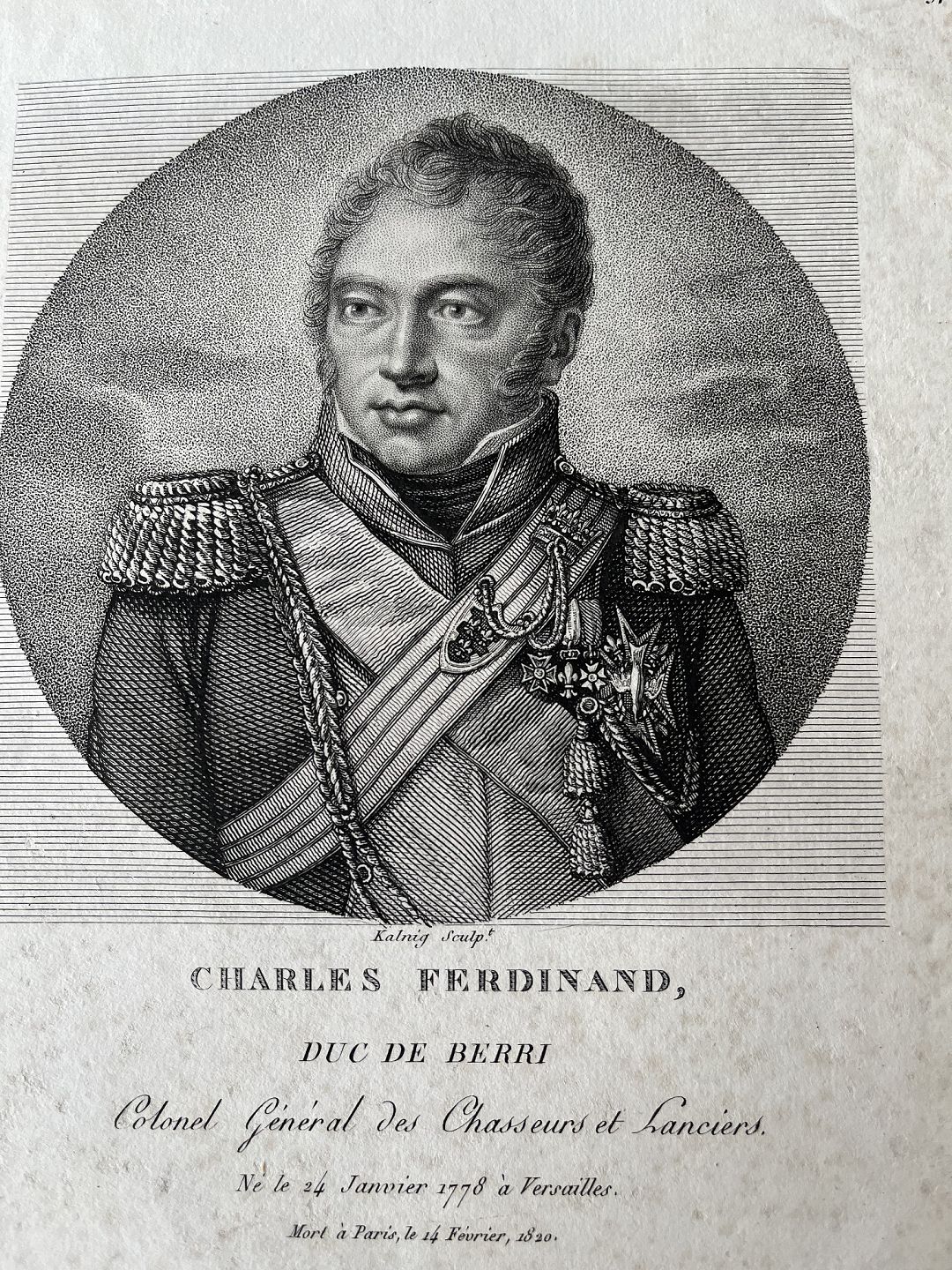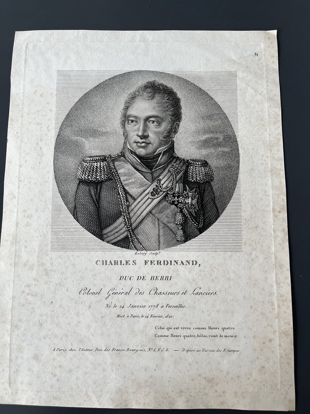 Kobberstik - Portræt af Hertug Charles Ferdinand d'Artois af Berry.