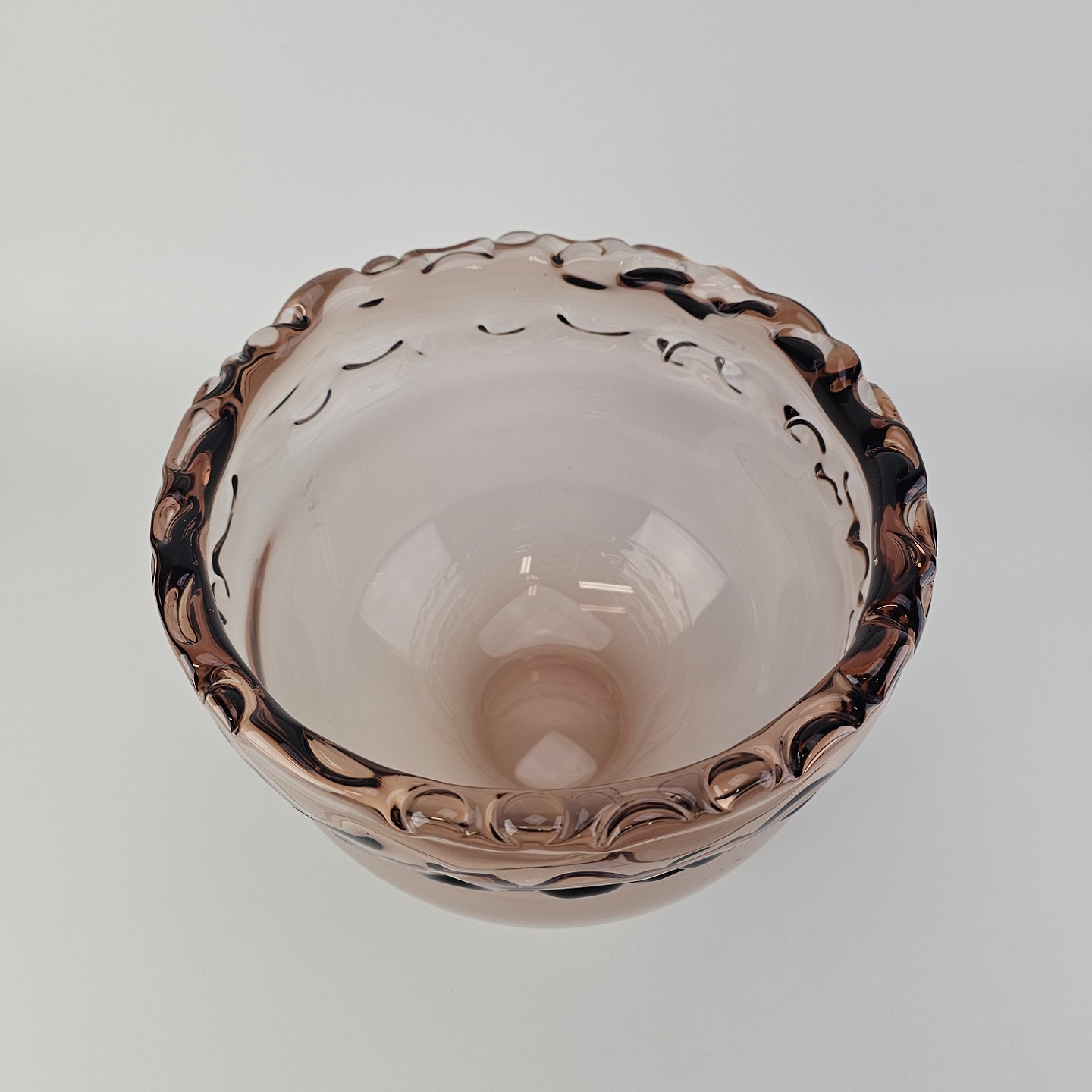 Skål i rosafarvet glas med bølget kant fra serien Rosamund