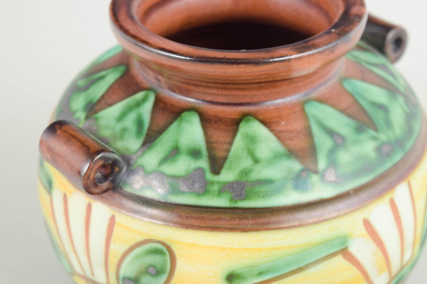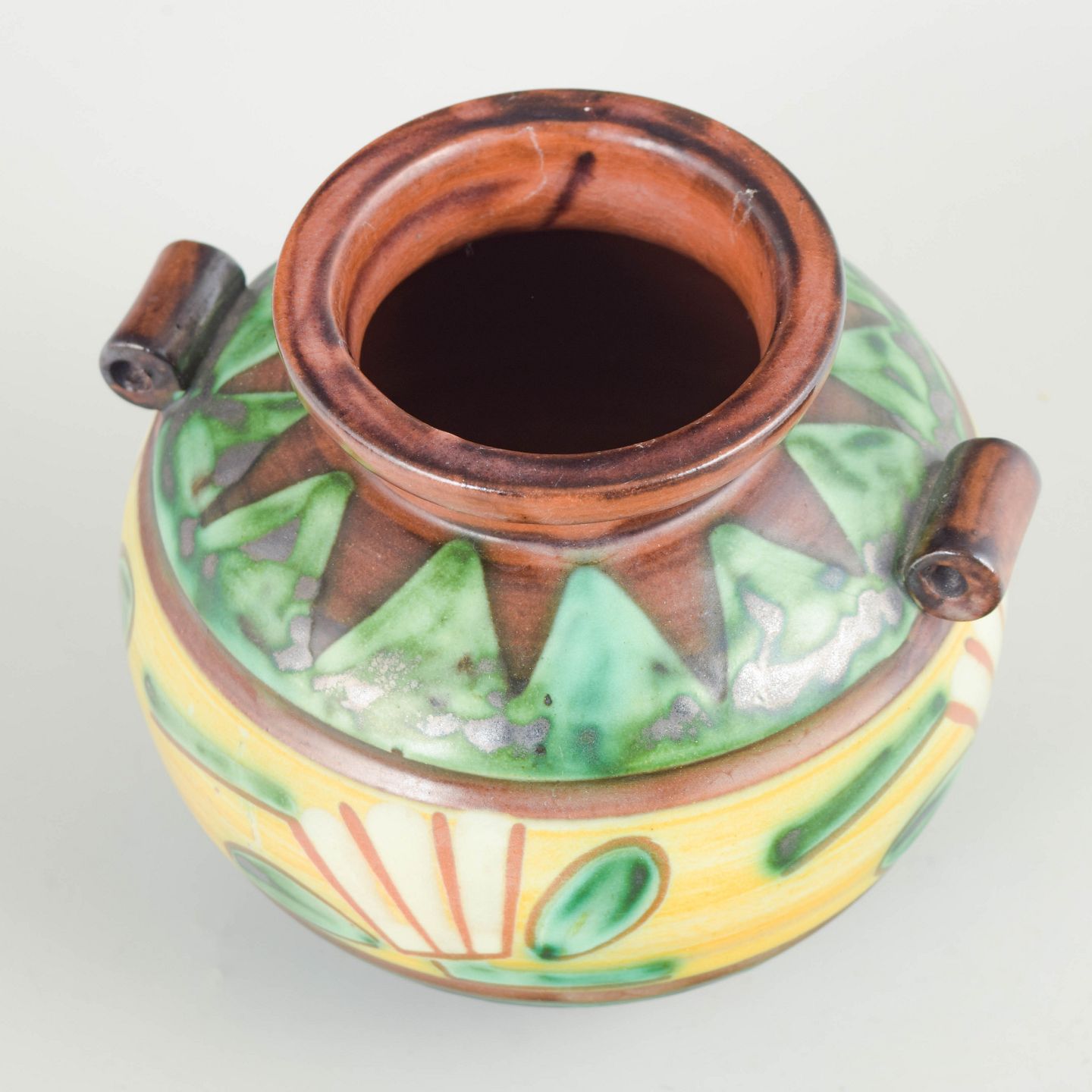 Keramisk vase i stentøj med polykrom glasur i grønne, gule og brune toner, dekoreret med stiliserede blad- og plantemotiver. Modellen er udført med små sidehåndtag og bærer fabriksmærke samt modelnummer 2750 i bunden.