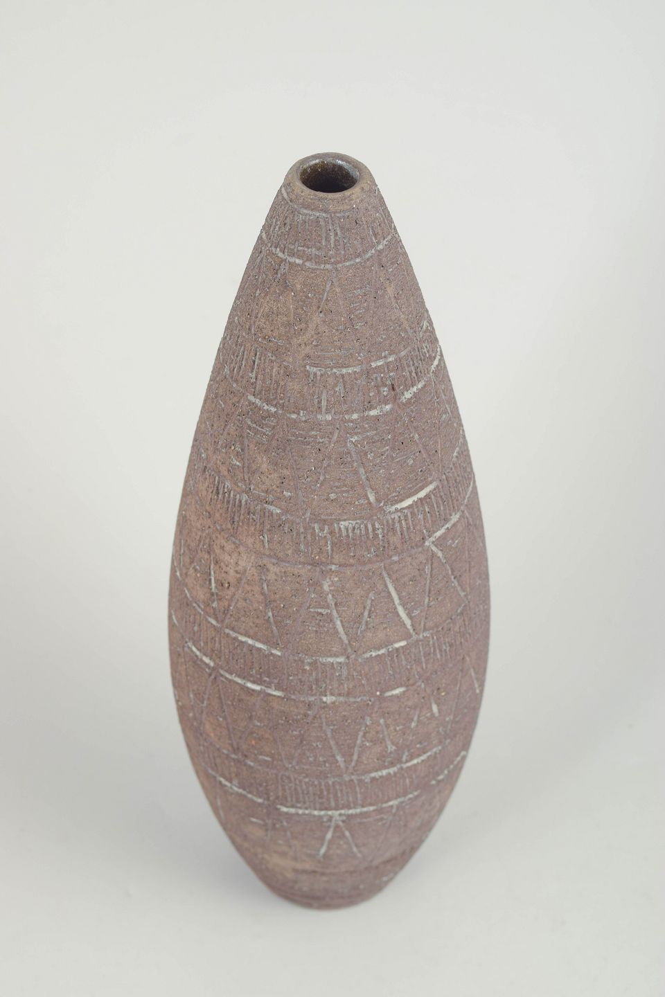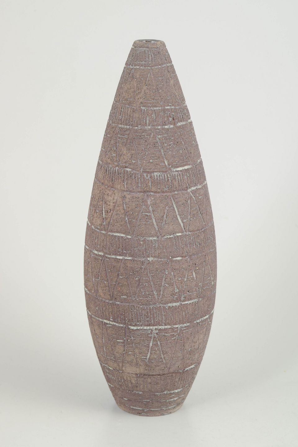 Slender conical vase in thrown stoneware with a raw, matte surface and incised geometric decoration. The stamped mark to the base indicates model 310.