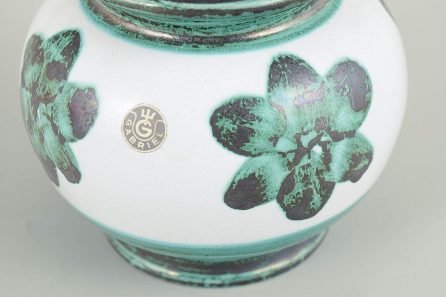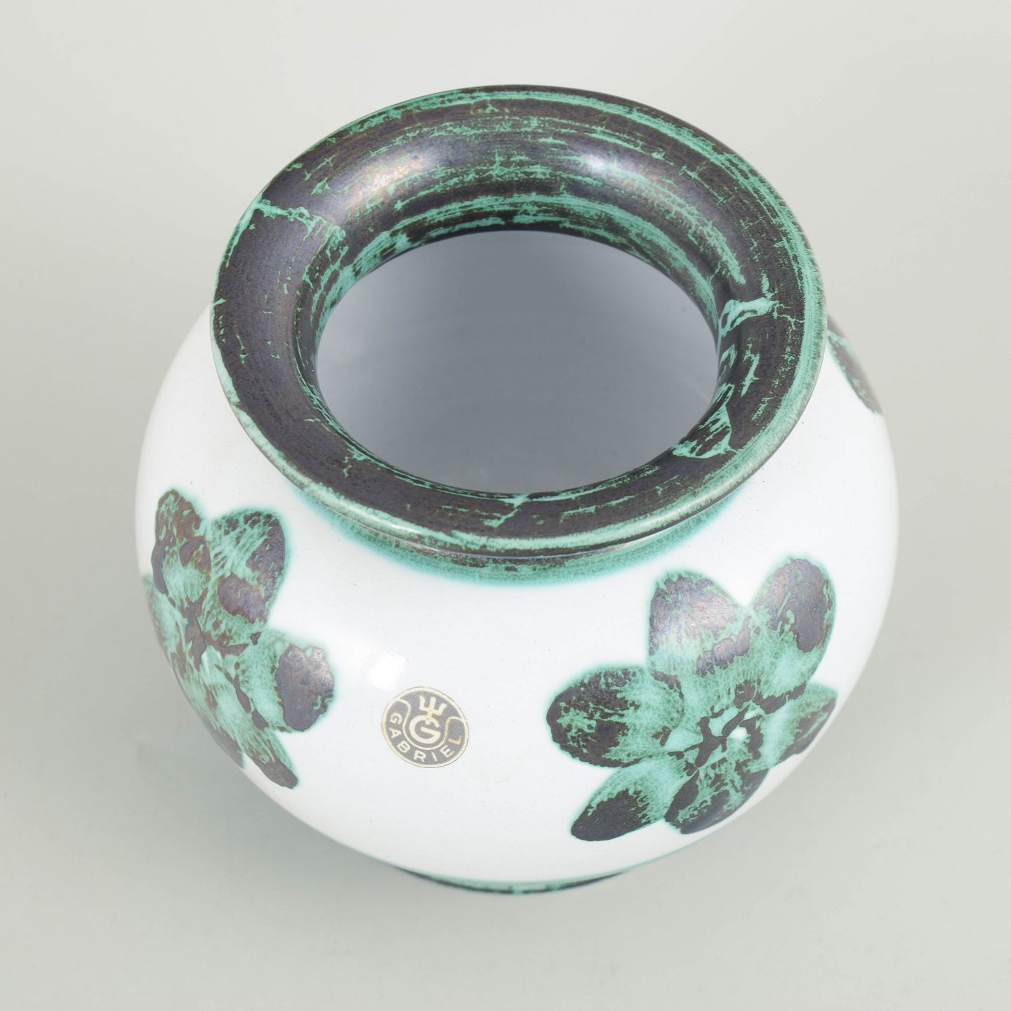 Rundbuget vase i glaseret fajance med hvid bund og stiliseret blomsterdekoration i grønne og mørke toner. Dekoreret med kontrasterende grøn rand og fod. Fabriksmærkat med modelnummer 121.