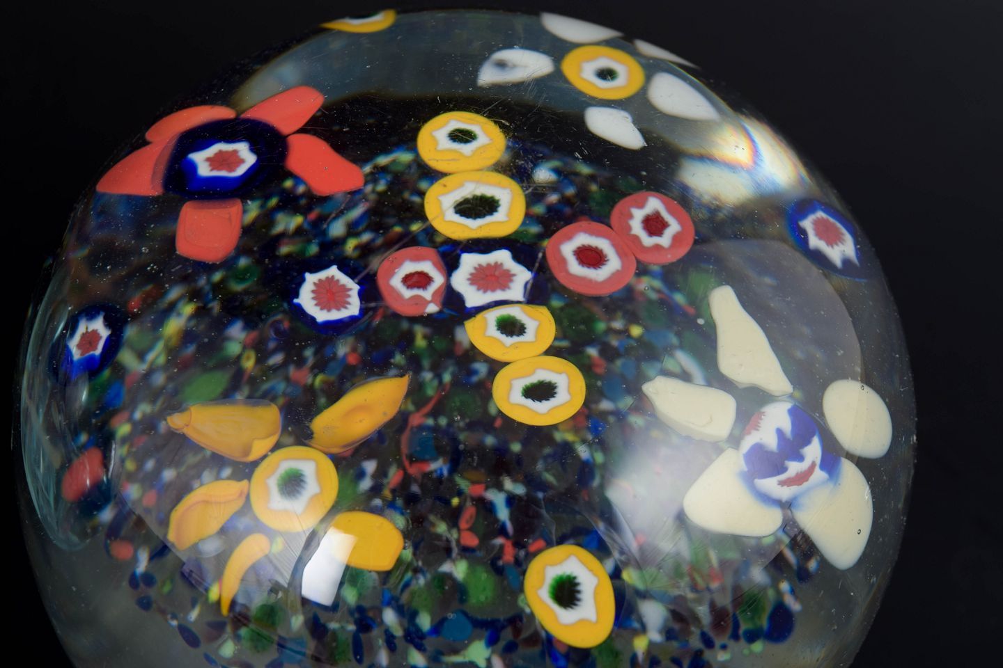 To Kugleformede brevpressere i klart kunstglas med indre farveelementer, herunder lagdelte strukturer, spredte luftbobler og dekorative indlæg i kontrasterende farver. Uden signatur.