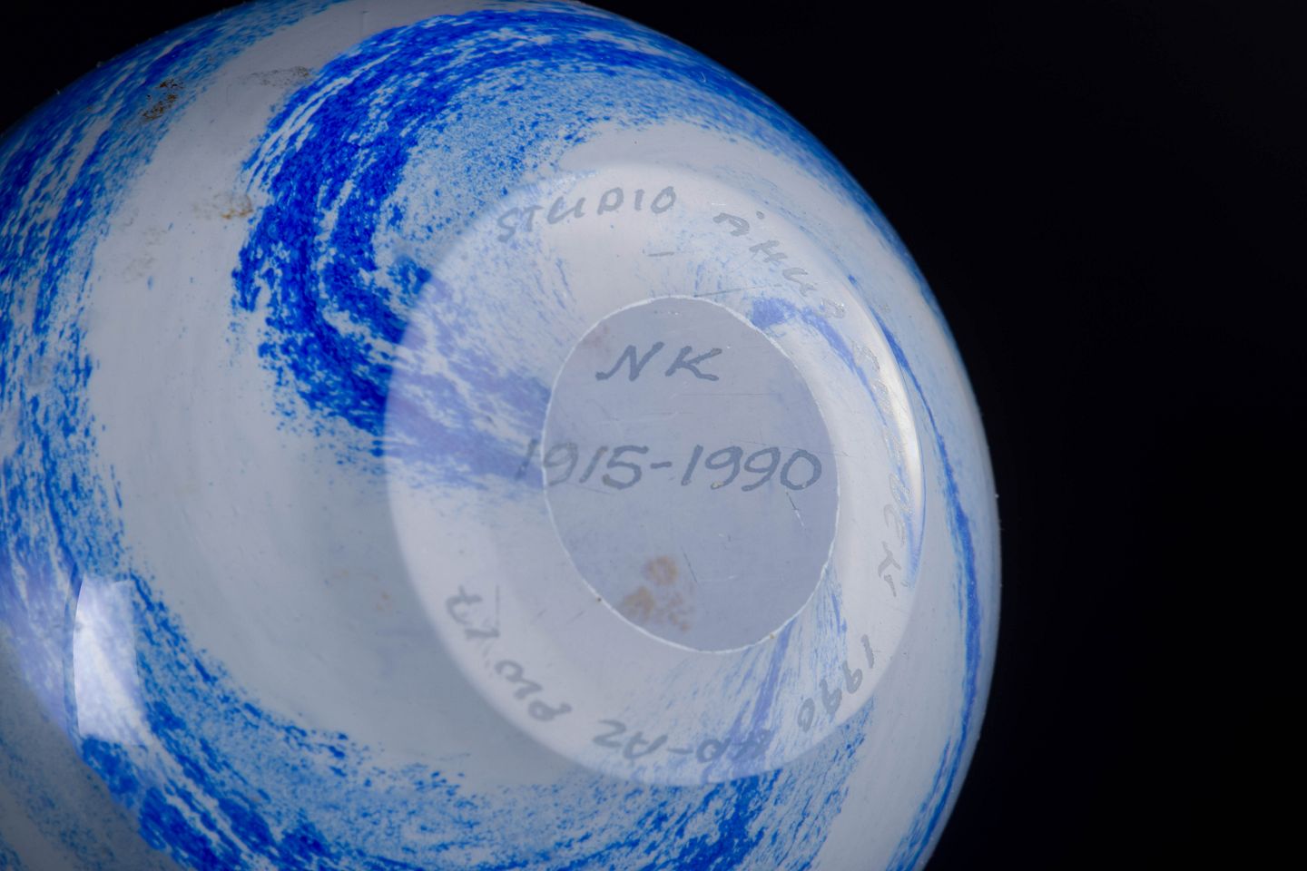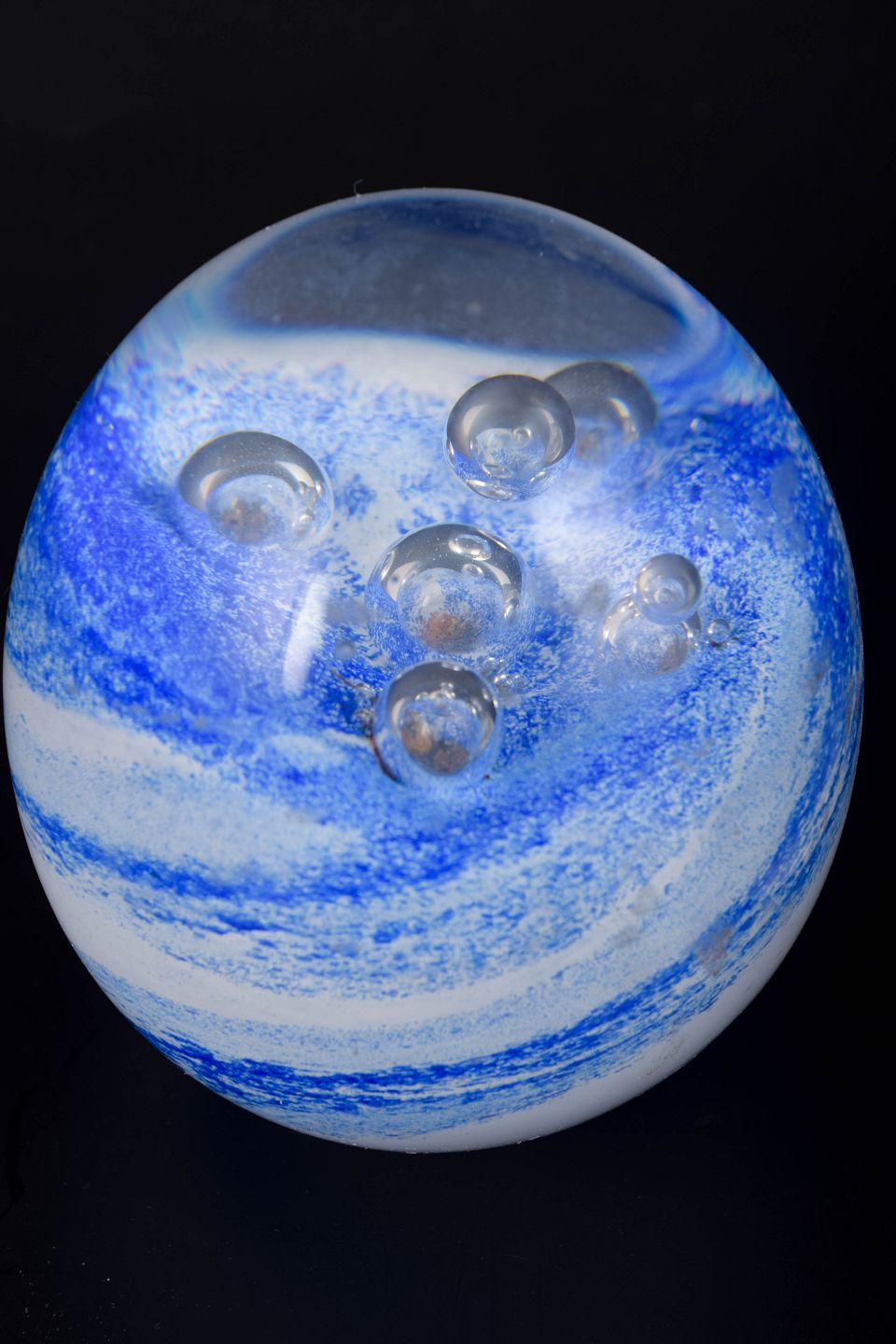 Organisk formet brevpresser i klart kunstglas med indre blå og hvide slør samt indkapslede luftbobler. Signeret i bunden “Studio Åhus, NK 1915–1990”.