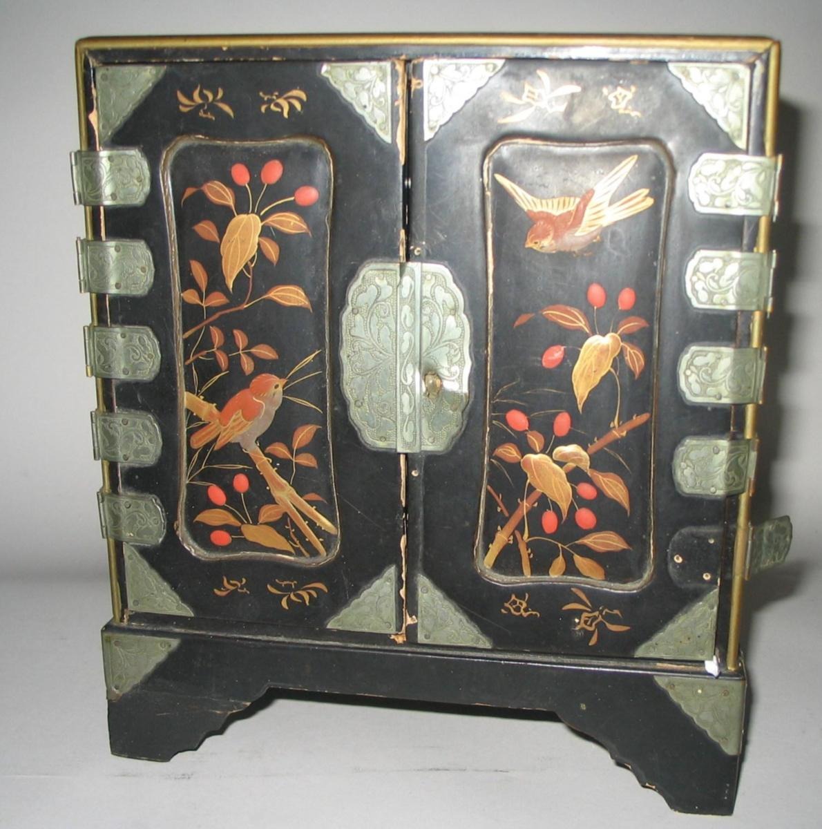 Chinese jewelry box in lacquer work with decorations in the form of birds on branches with berries. With two doors; inside with three drawers - also with decorations. H.: 21 cm. D: 11 cm. W.: 19 cm. With a few chips.