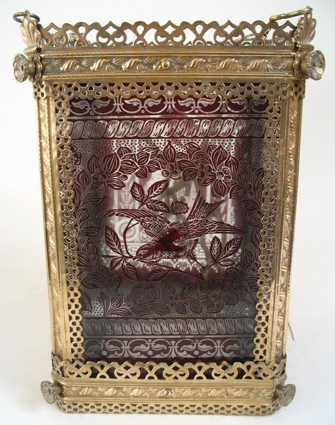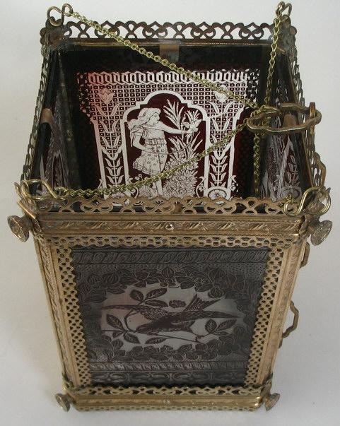 Ampel, Tyskland, ca.1880. I gennembrudt messing med dekorationer i form af roser, afhvalmede hjørner og knopper. Ophængt i kæde. Sider i form af klart glas. Med overfangsdekoration i rødt, med ung kvinde i en have og en fugl på en gren. Bunden i klart glas. H.: 30 cm. B.: 21 cm.