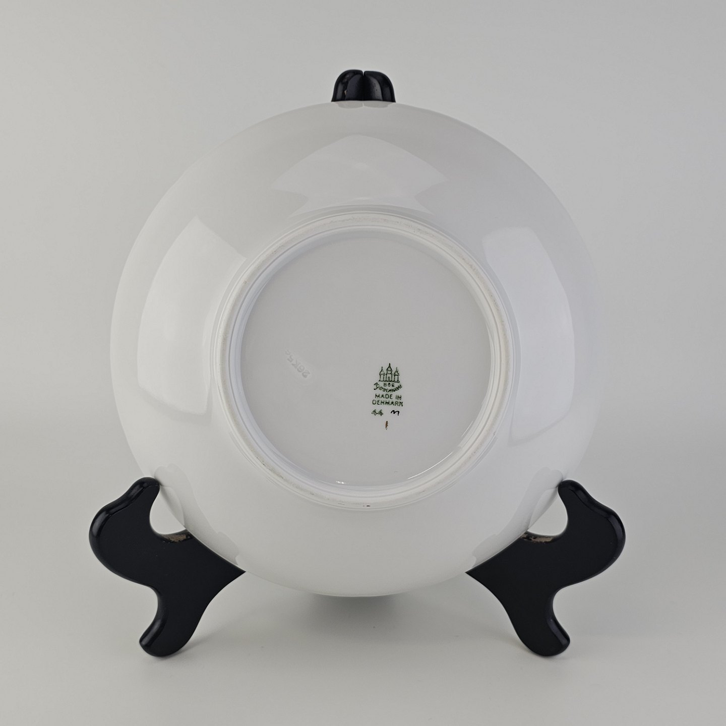 Krysantemum er hvidt porcelæn dekoreret med lys lilla blomst, grønne blade og guldkant.
