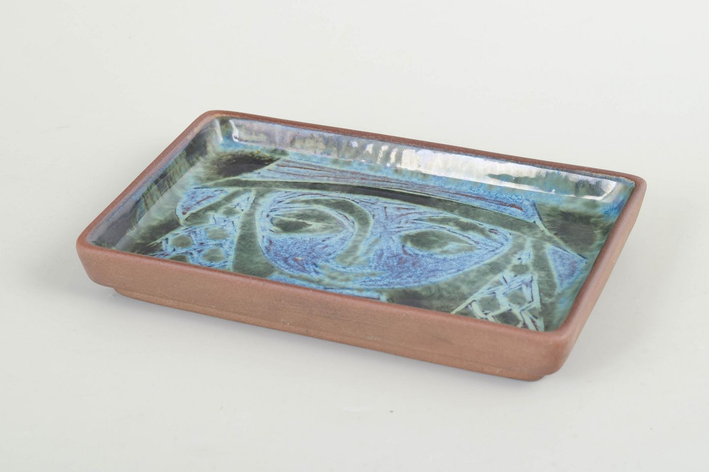 Rektangulært stentøjsfad med reliefdekoration forestillende stiliseret ansigt. Udført i brunligt stentøj med blå og grøn glasur i fordybningerne. Model 5906.