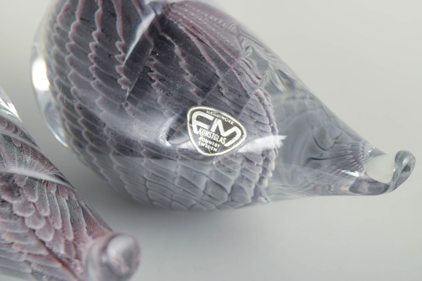 To dekorative ænder i massivt kunstglas med klar overdel og indre mønster i violette og grå nuancer. Udført med bølgende striber og afrundede former. Begge med originalt mærkat fra FM Konstglas, Ronneby.