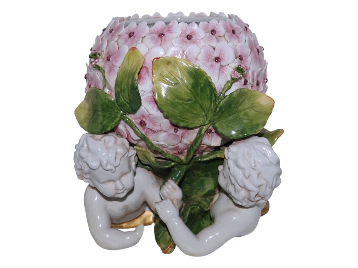 To store urtepotteskjulere i porcelæn med hortensia og engle.