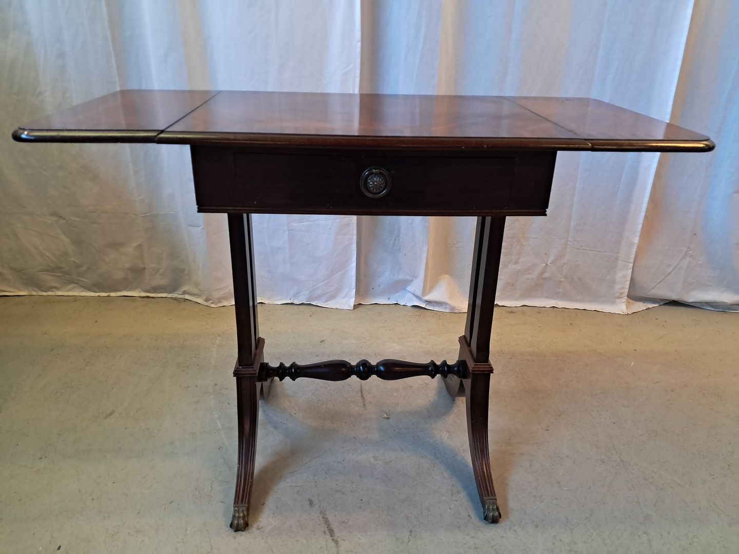 Bord med klapper og skuffe i fineret mahogni, fra 1980erne.