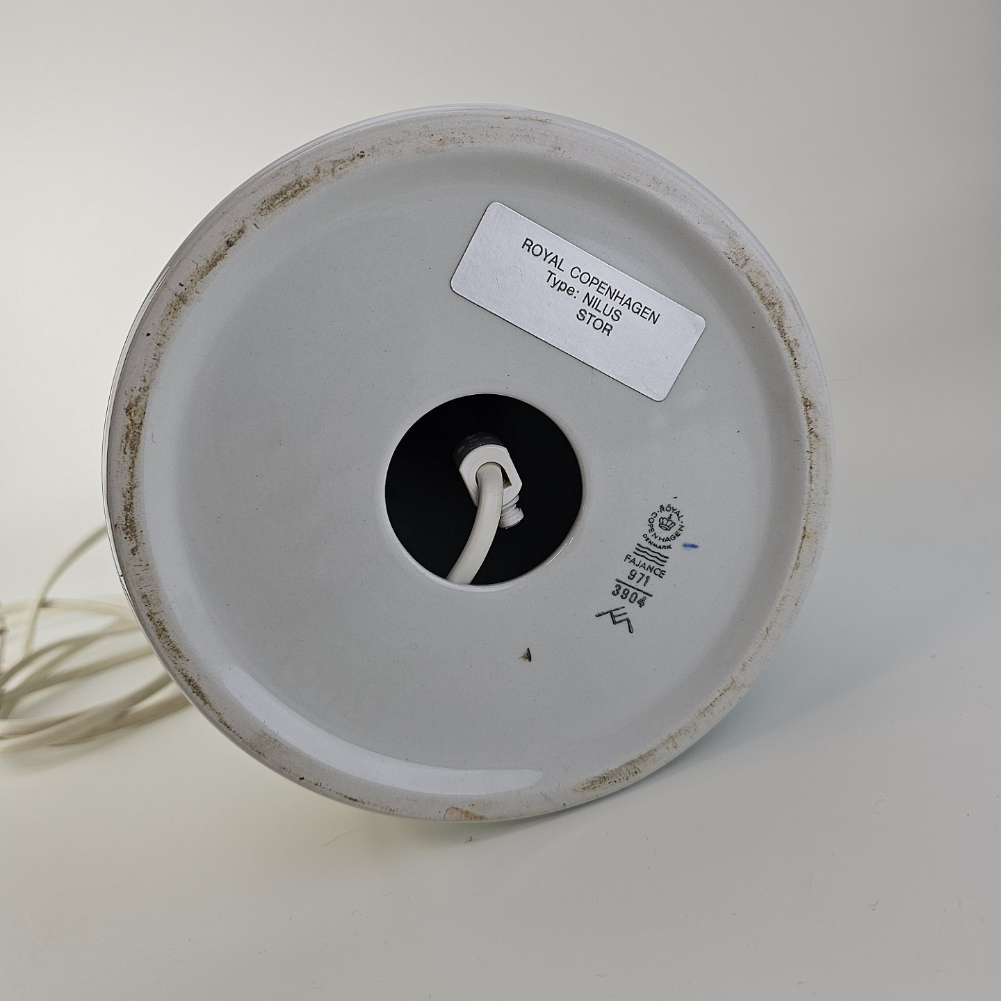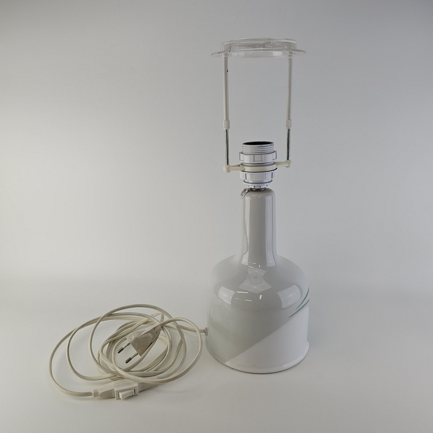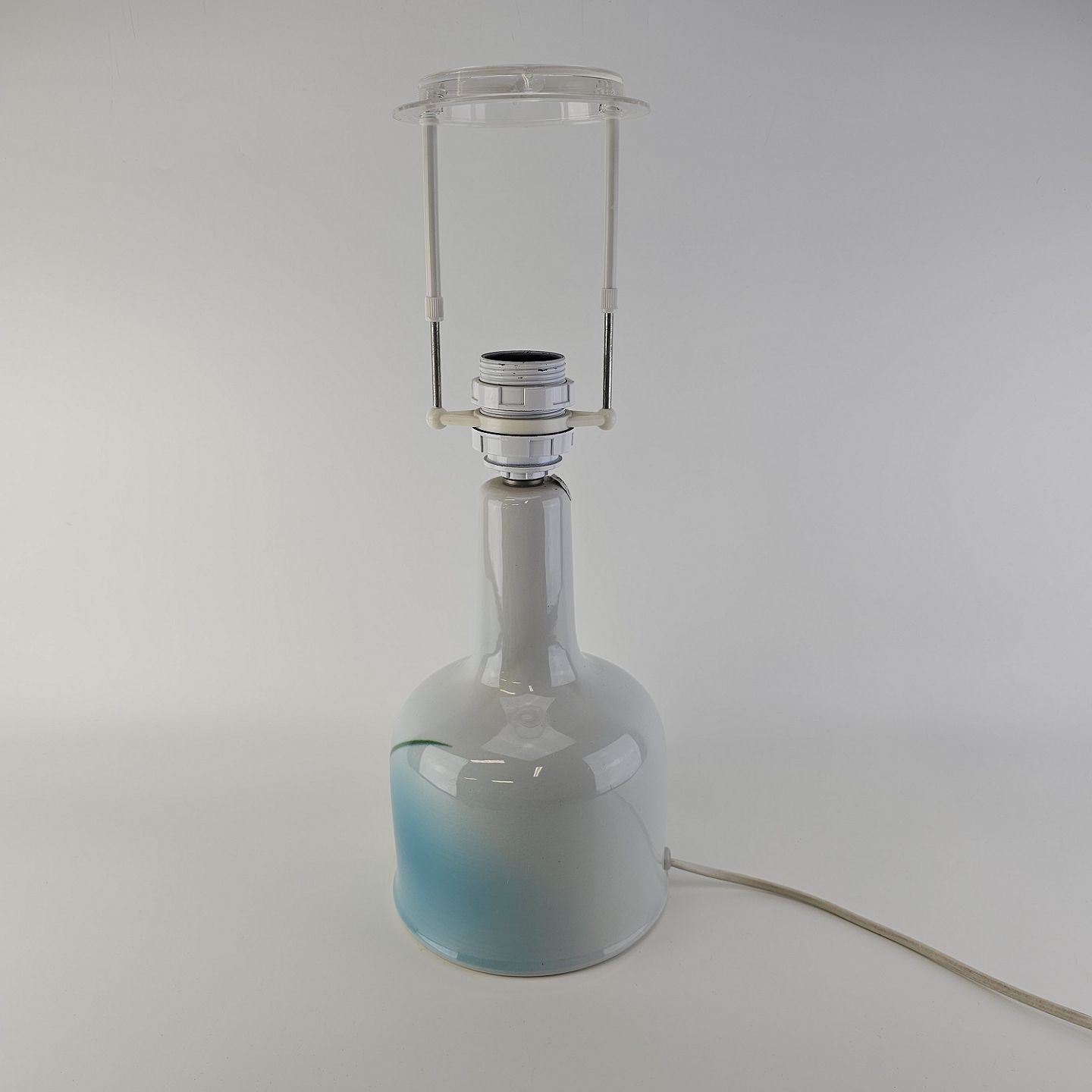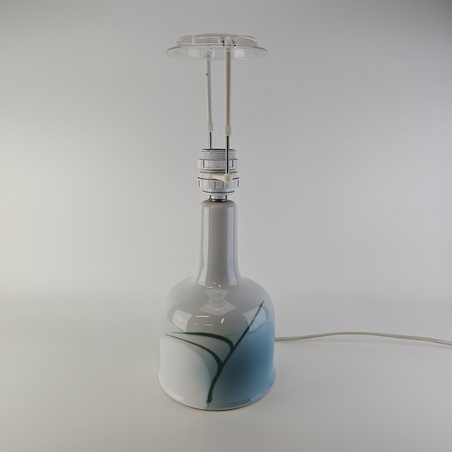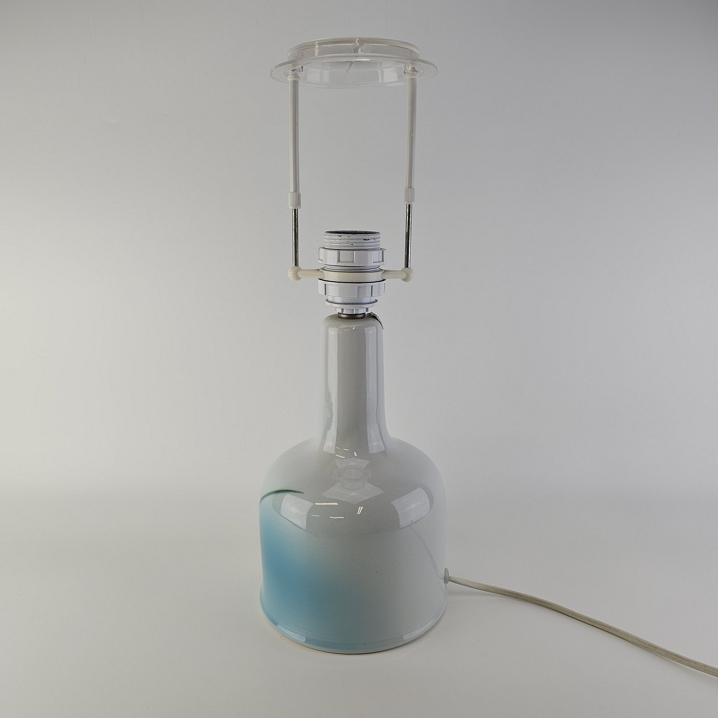 Lampefod i hvid fajance med dekoration af blå graduering og sorte streger, model Nilus