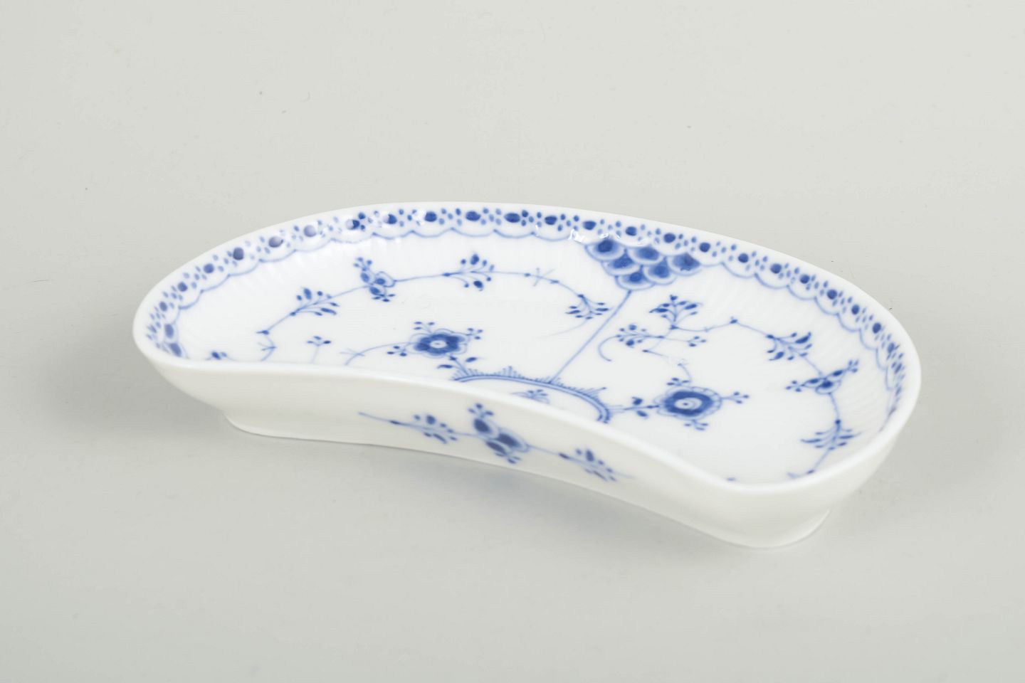 Halvmåneformet fad i håndmalet porcelæn fra Musselmalet Halvblonde med klassisk underglasurdekoration i koboltblå, riflede felter og karakteristisk blondekant. Model 1/559. Første sortering. Fremstillet i 1920’erne.