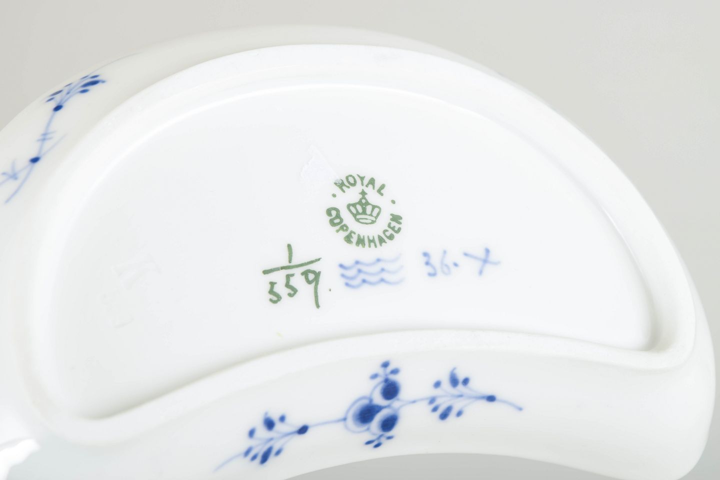 Royal Copenhagen Musselmalet Halvblonde, halvmåneformet fad.