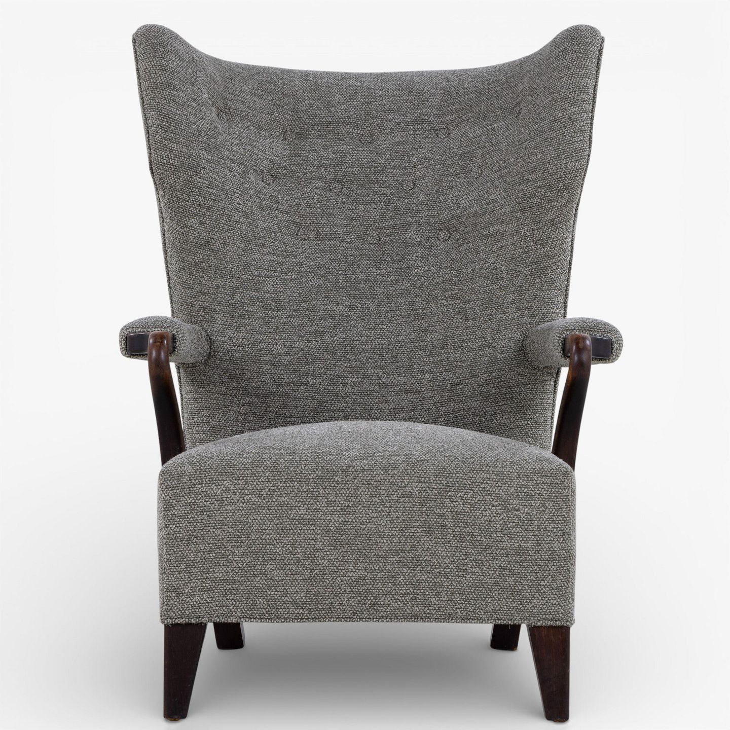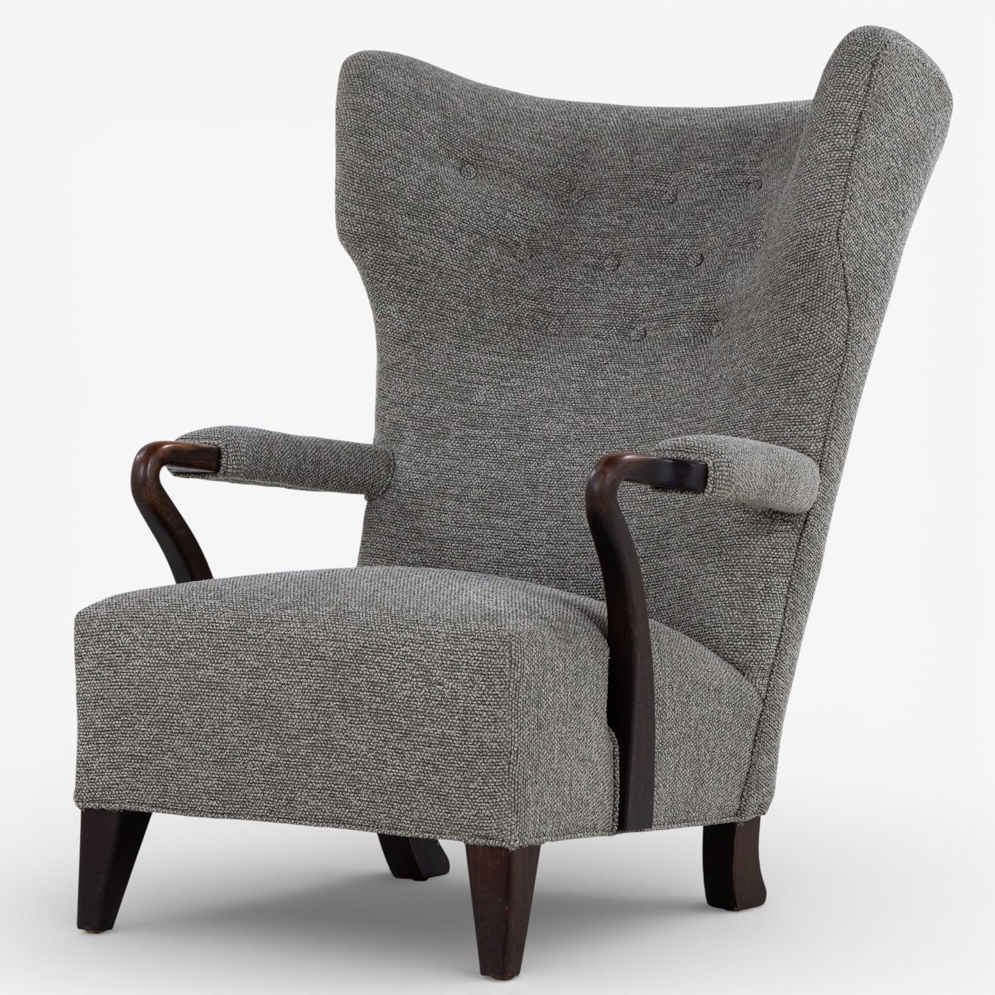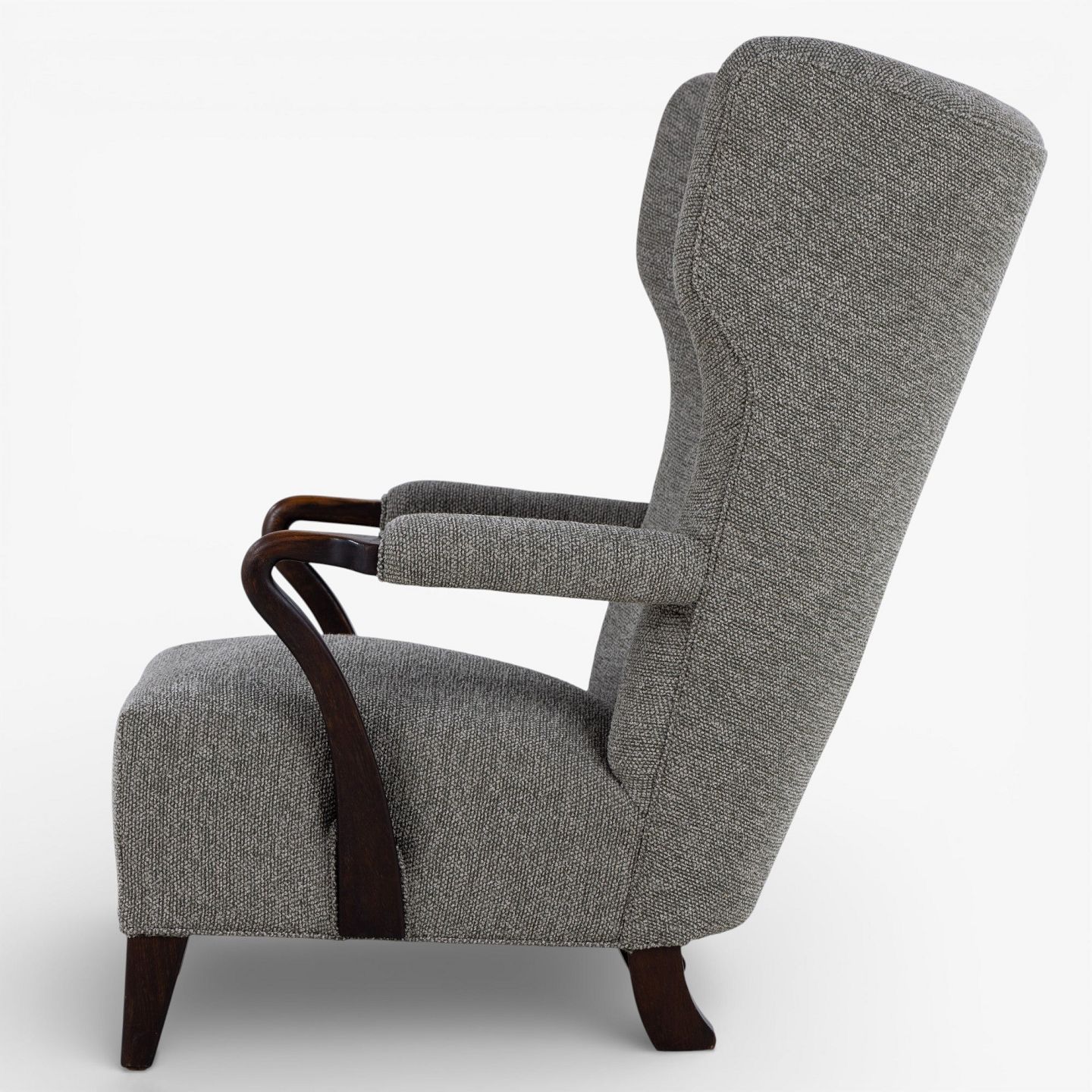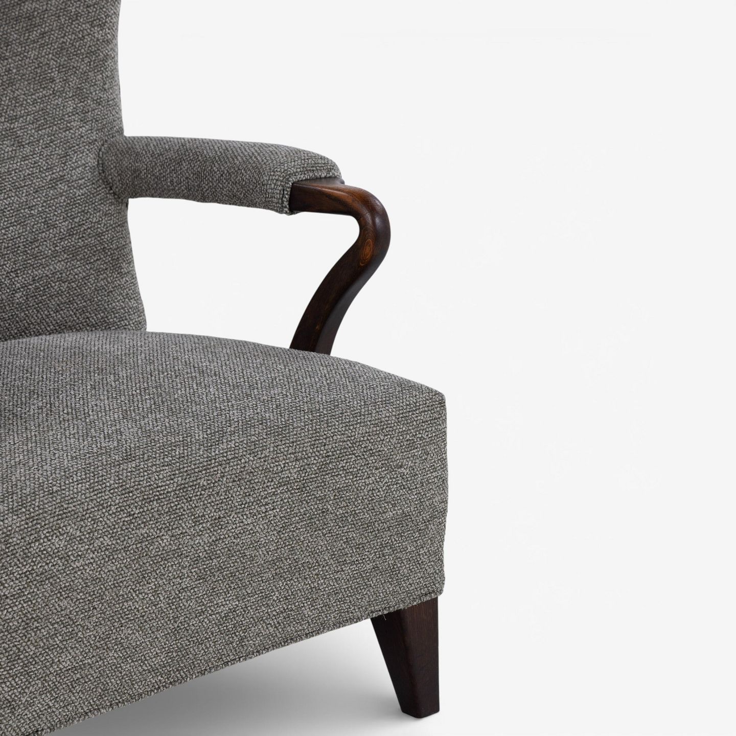 High-backed armchair upholstered in new 'Moss' fabric (color: 0002) with arms and legs in stained oak.