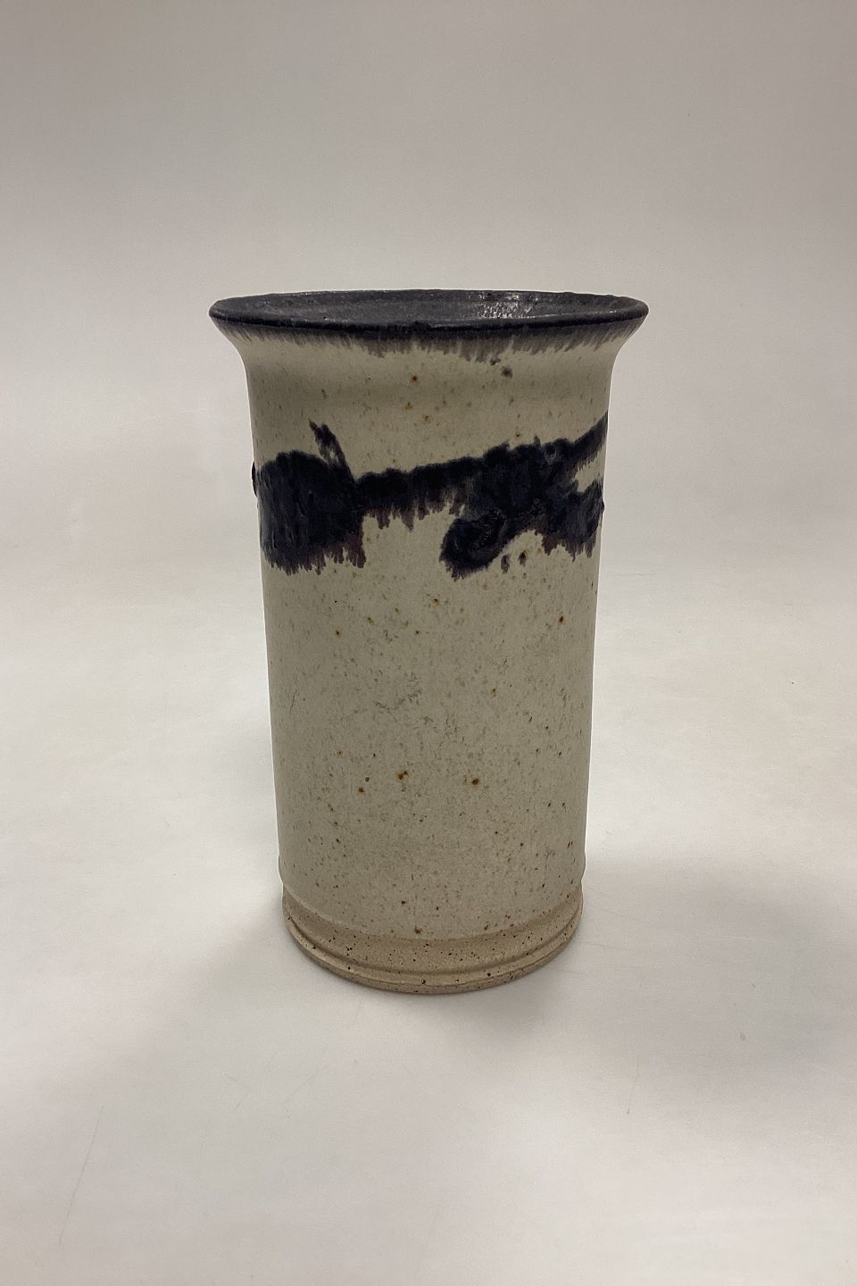 Bjørn Keramik Stentøjsvase. Nistret råhvid bund med mørk blålilla grafisk dekoration.