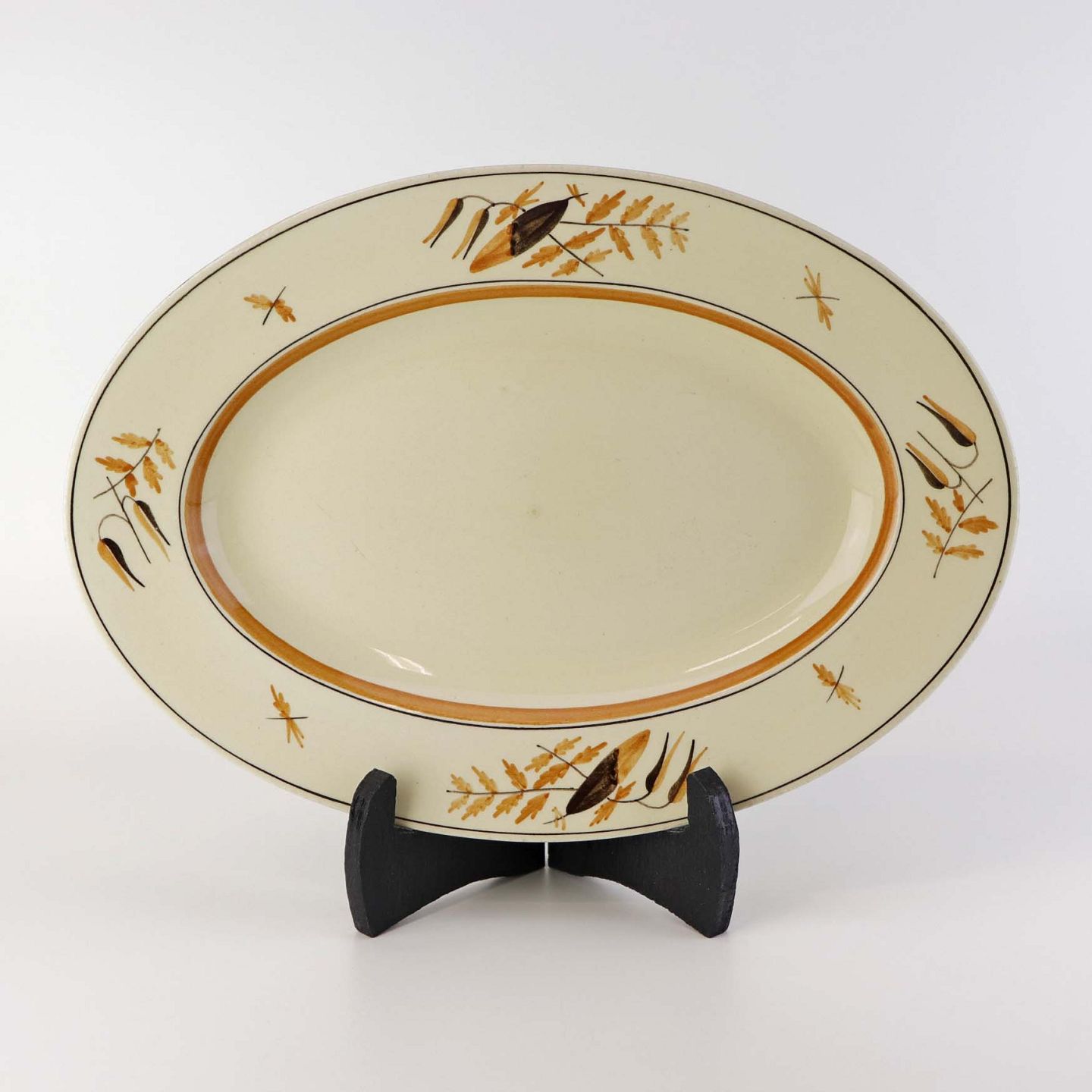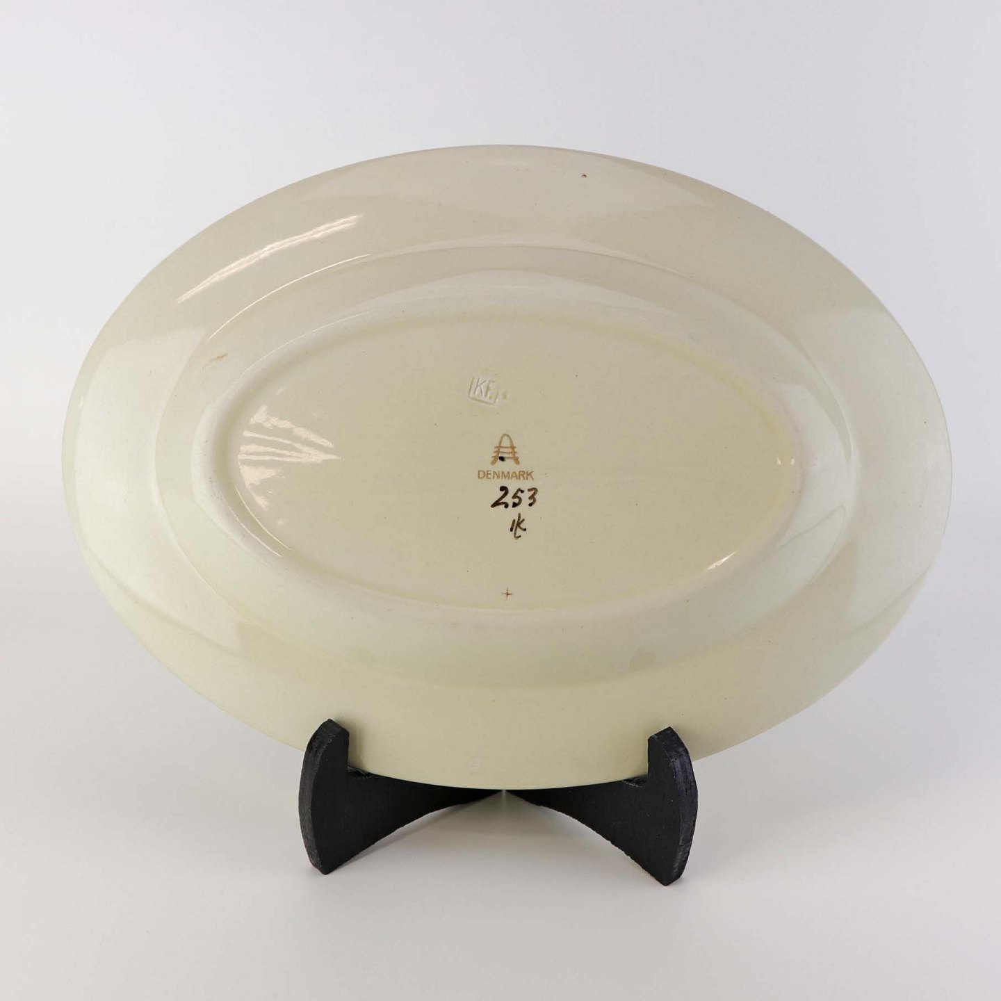 Lille ovalt serveringsfad i fajance fra stellet Åkjær, som blev fremstillet i perioden 1934-1939. Nr. 253