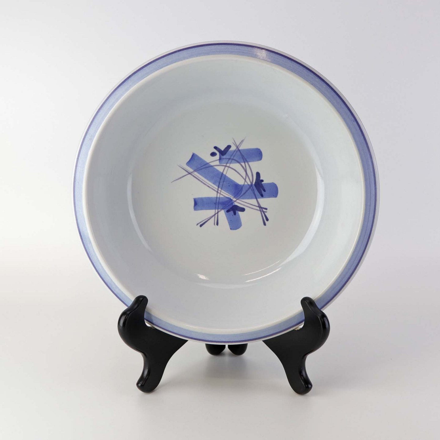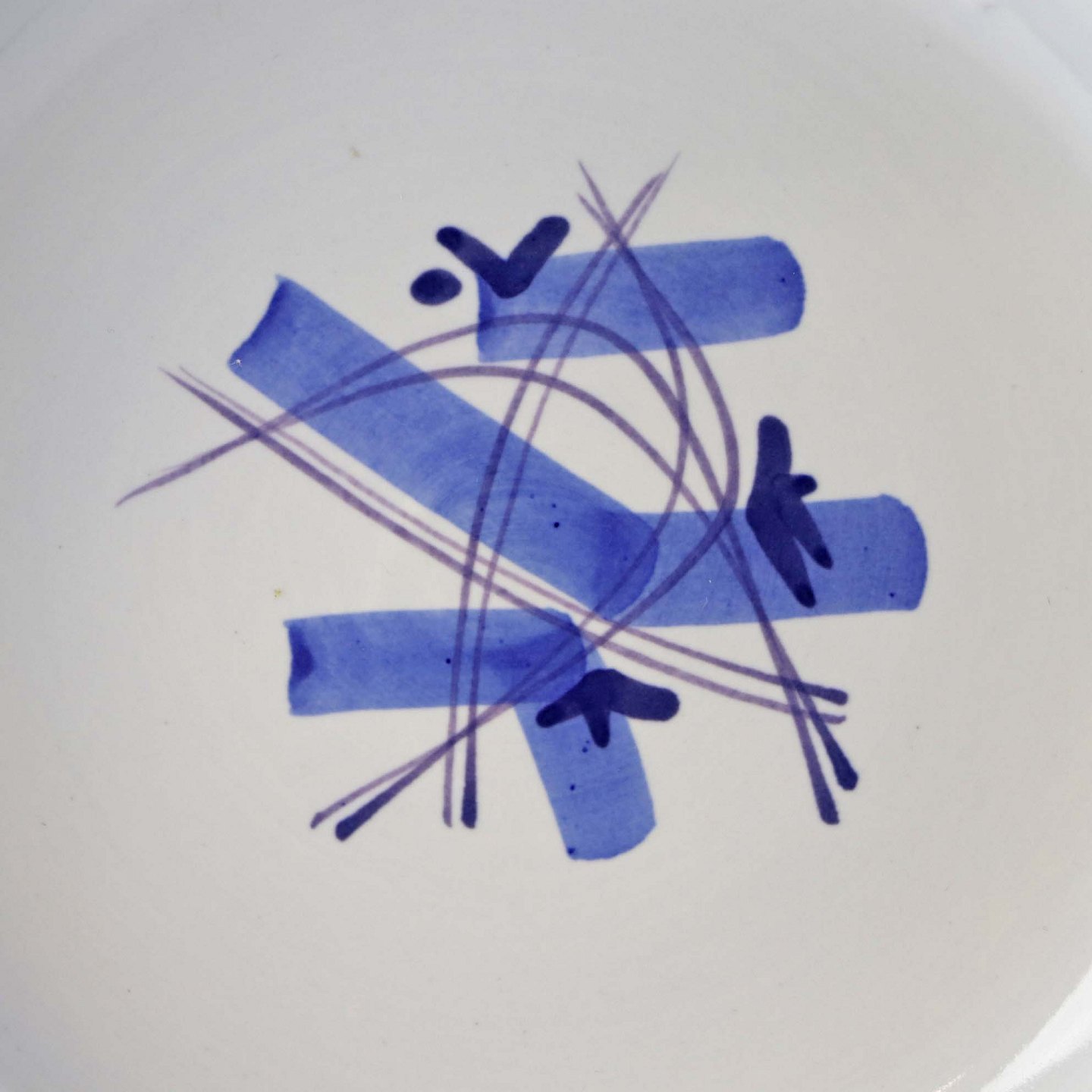Fajancestel i stelform CA med dekoration af abstrakt motiv i blå og lyseblå på en råhvid baggrund.