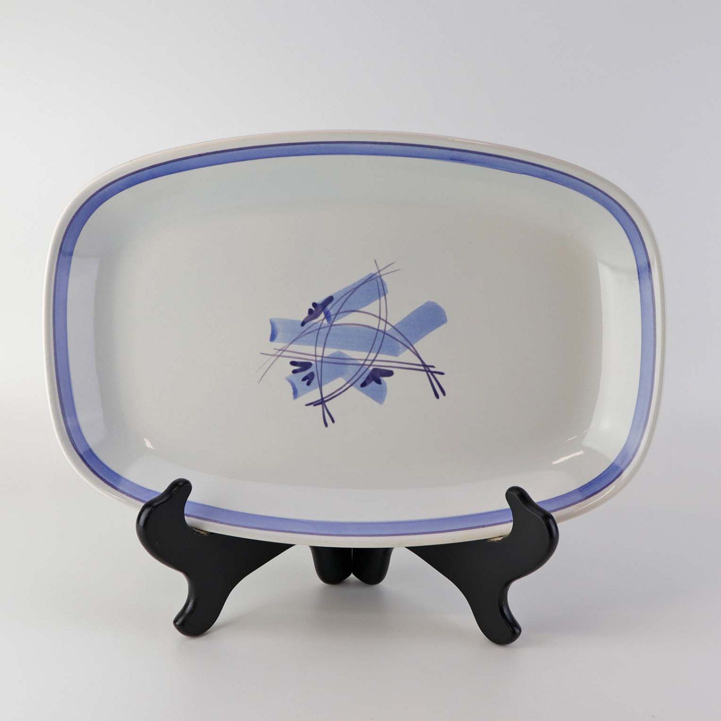 Fajancestel i stelform CA med dekoration af abstrakt motiv i blå og lyseblå på en råhvid baggrund.