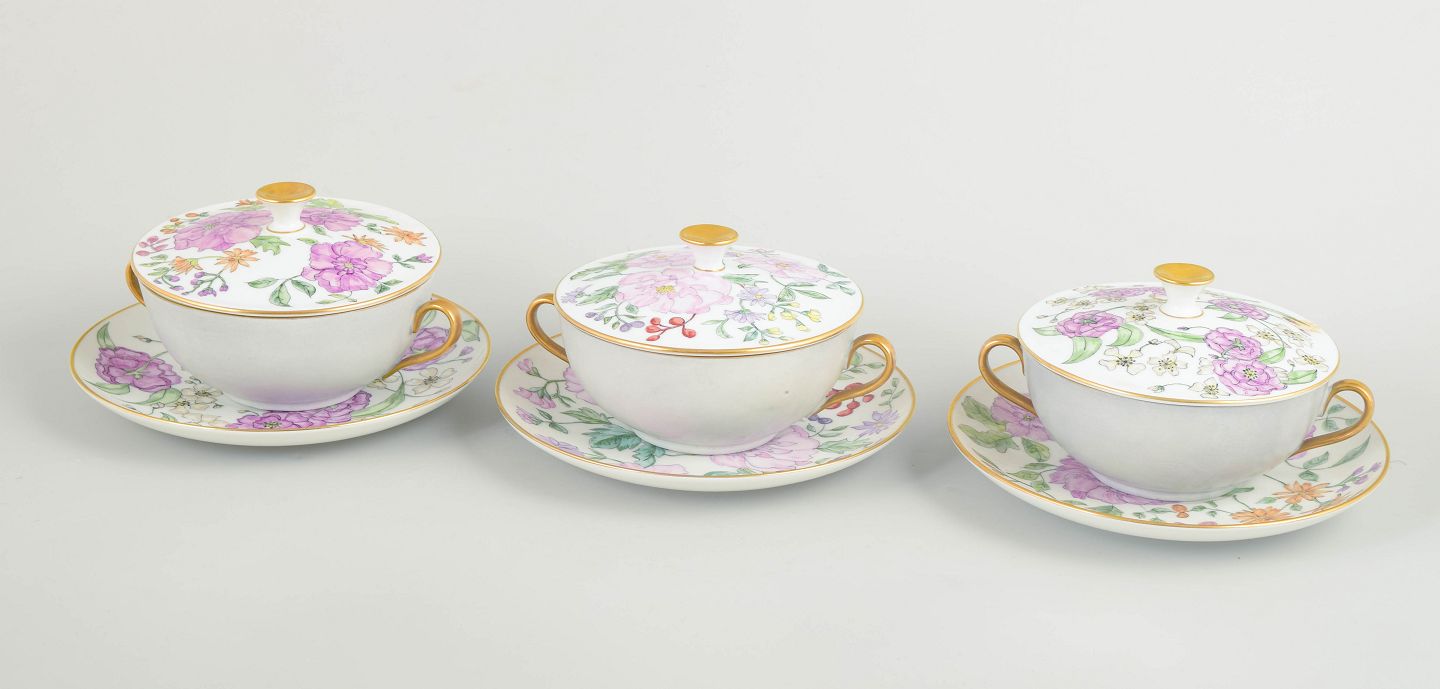 Håndmalede bouillonkopper med låg og dobbelte hanke i porcelæn med polykrom blomsterdekoration og guldkant.