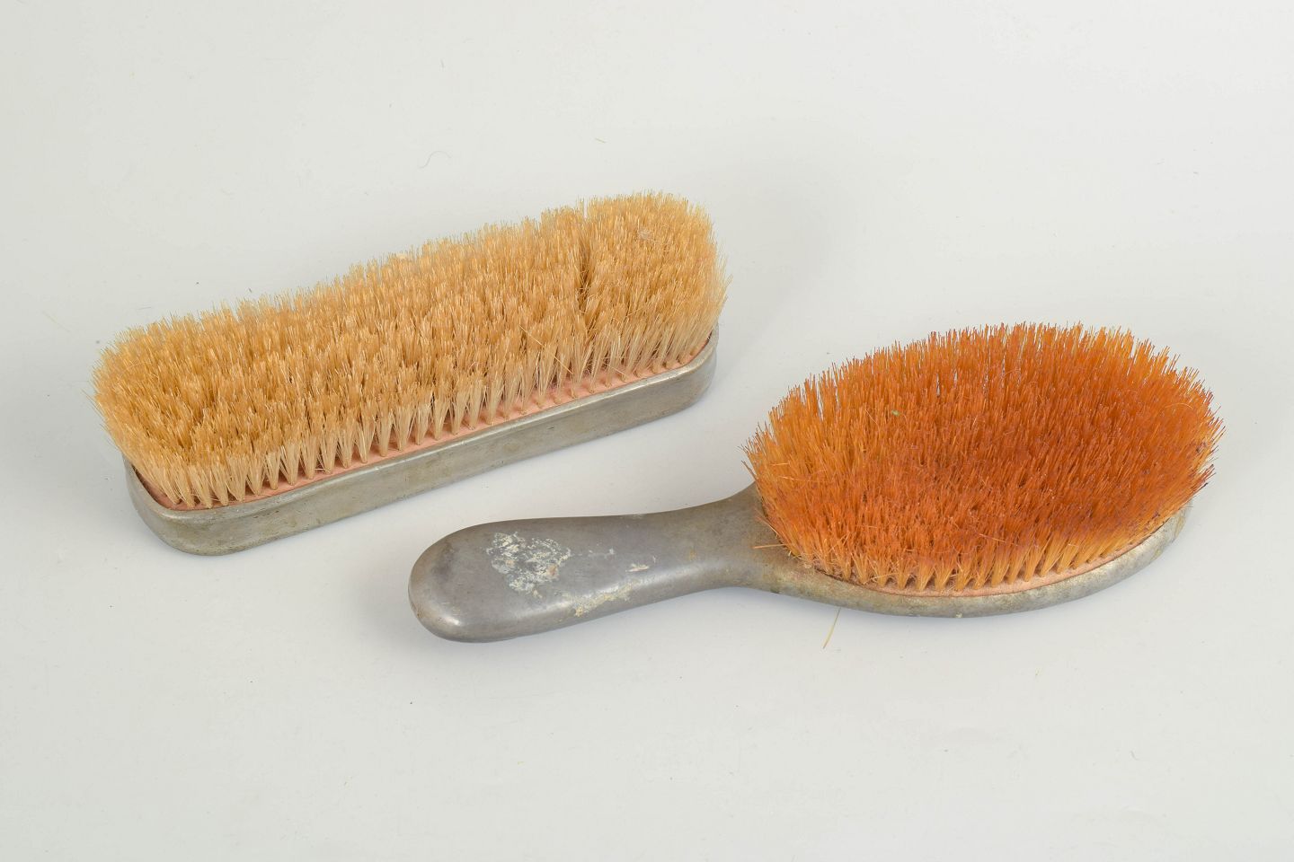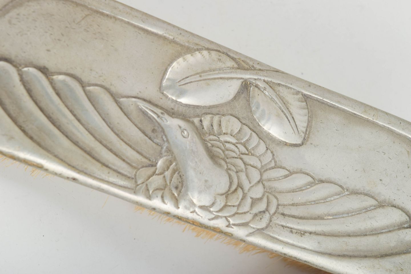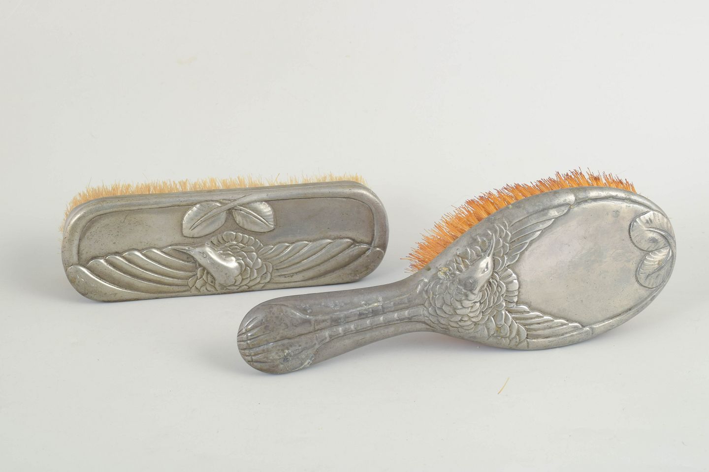 Børstesæt i tin udført i jugendstil med reliefdekoration af hejre og stiliserede naturmotiver. Består af to børster med dekorative skaftformer. Model Hejre.