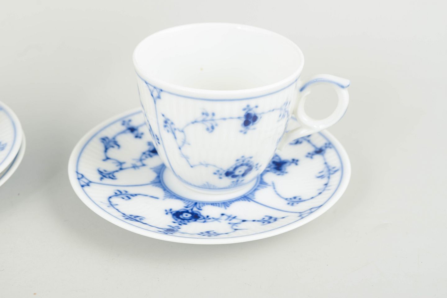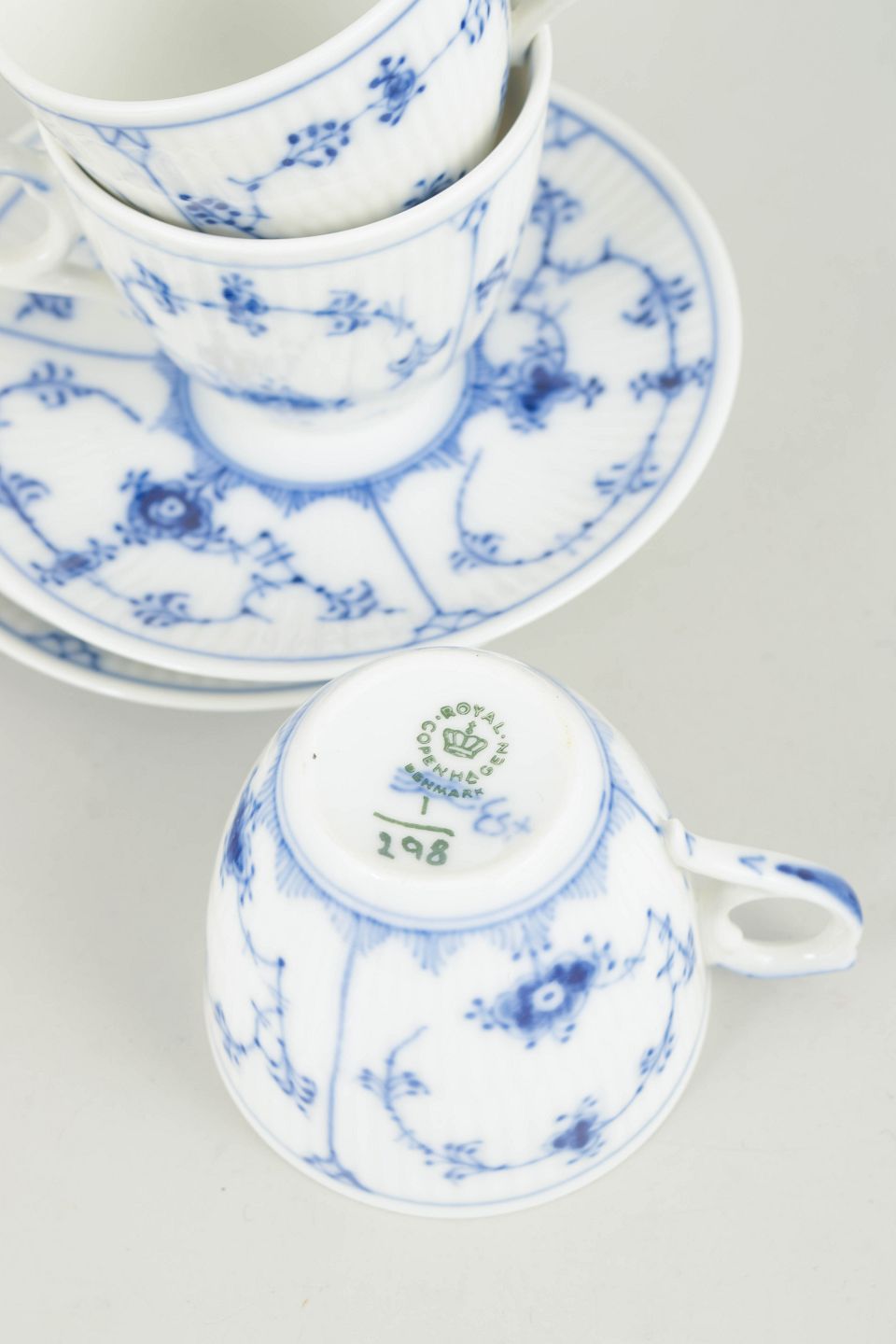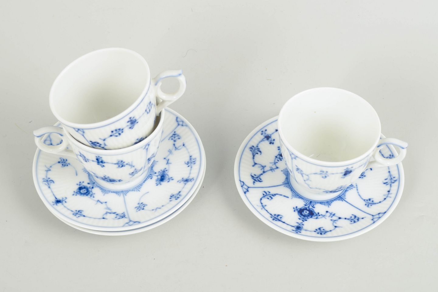 Royal Copenhagen Musselmalet Riflet, sæt af tre mokkakopper med underkopper.