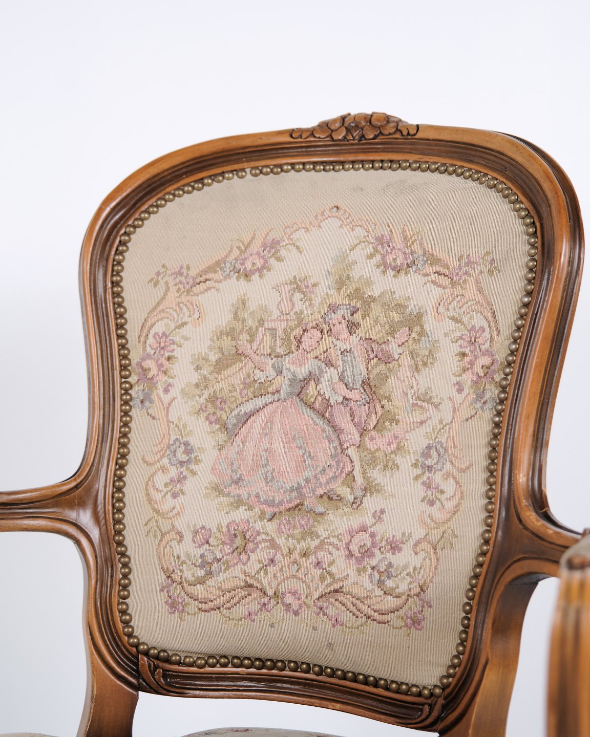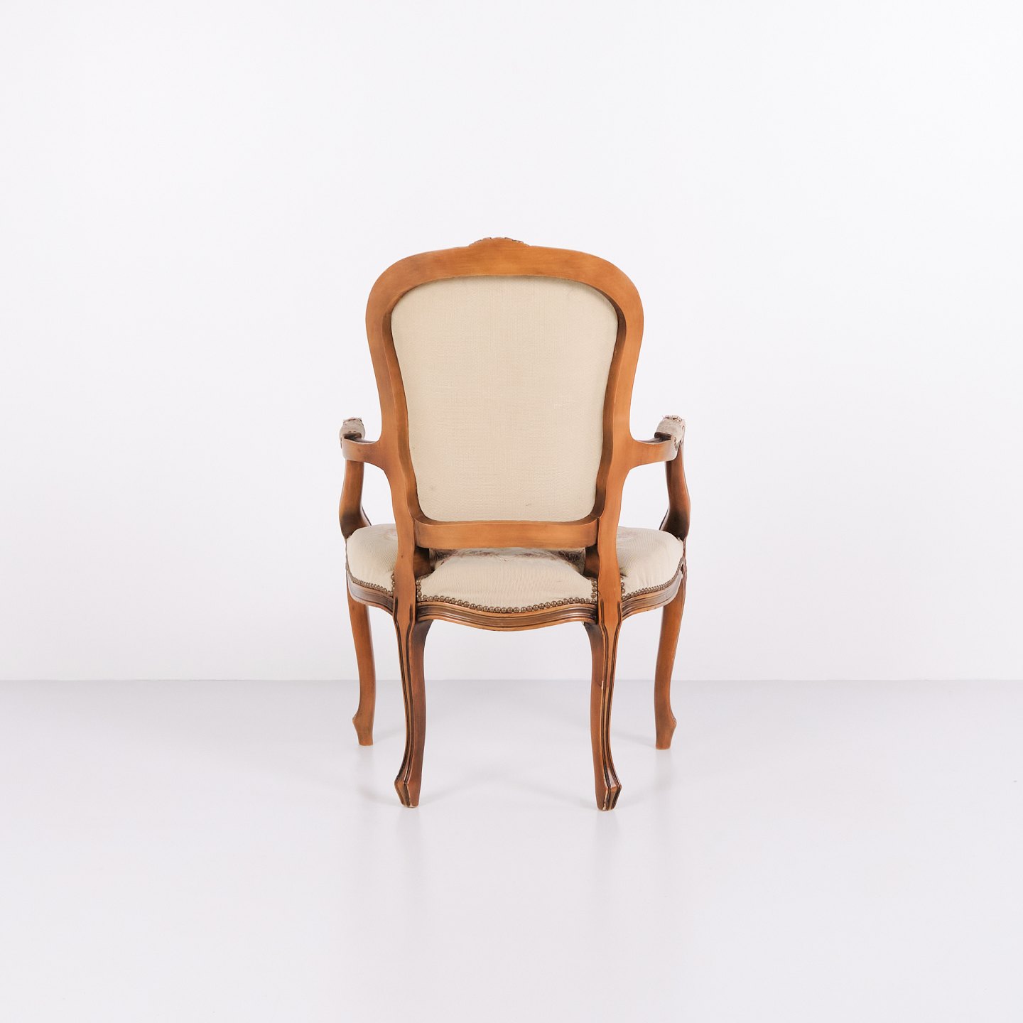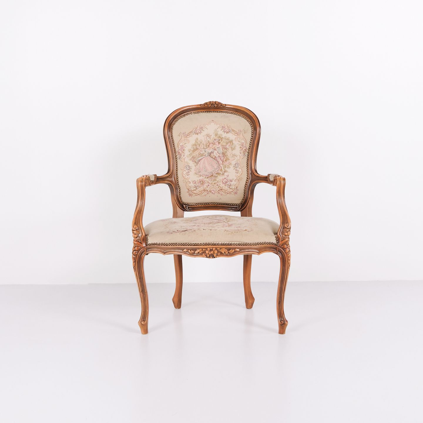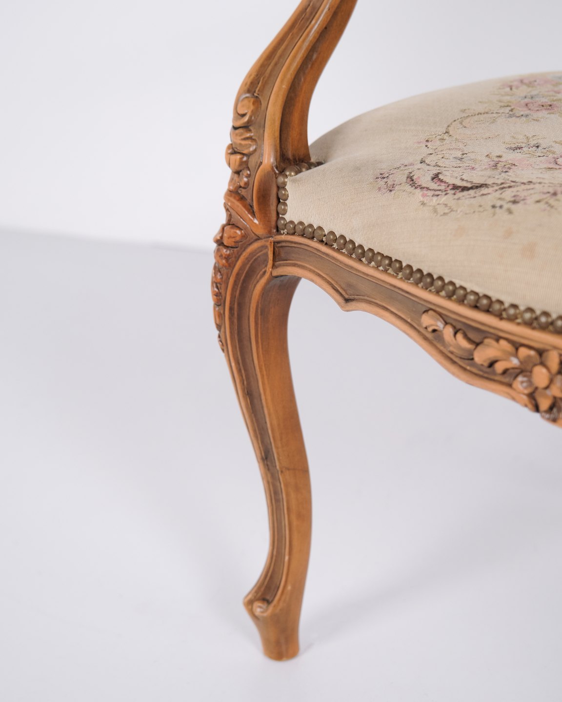 Nyrokoko armstol fra 1930’erne med buede ben og mønstret blomstret stof. Klassisk og dekorativt møbel i elegant stil.