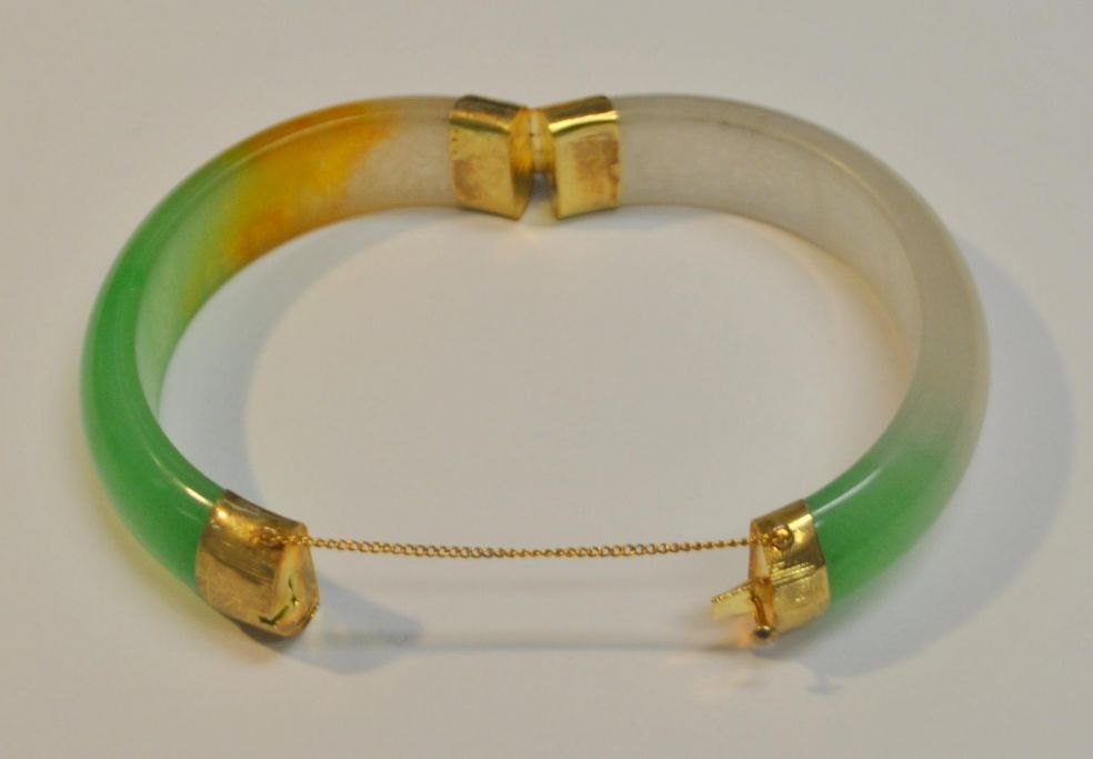 Chinese jade bracelet, 20th century. With gold clasp in 8K red gold. Inner diameter: 6.2 cm. Outer: 8 cm.