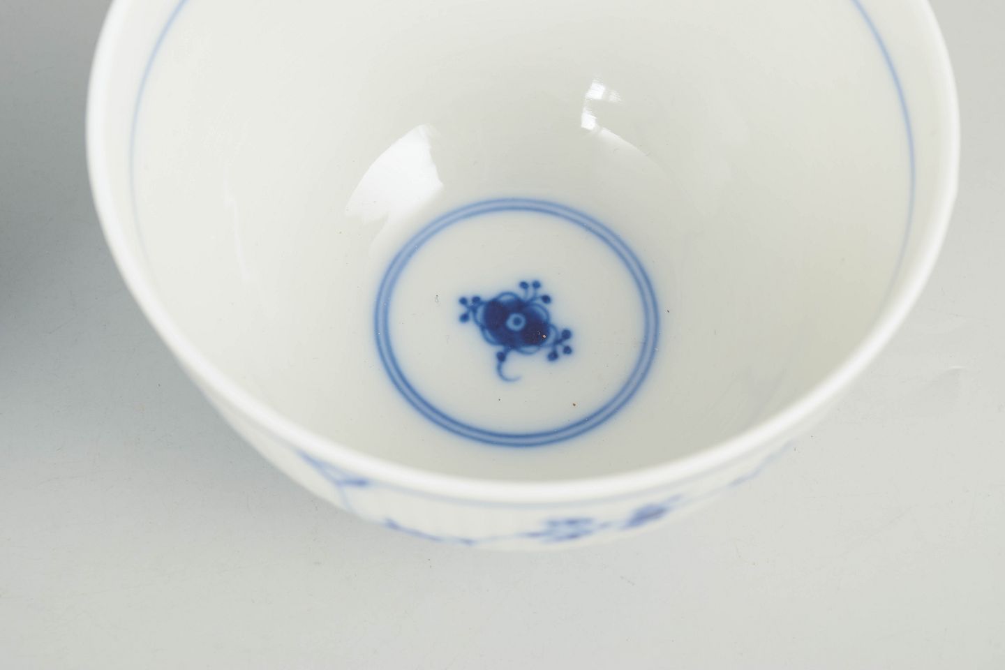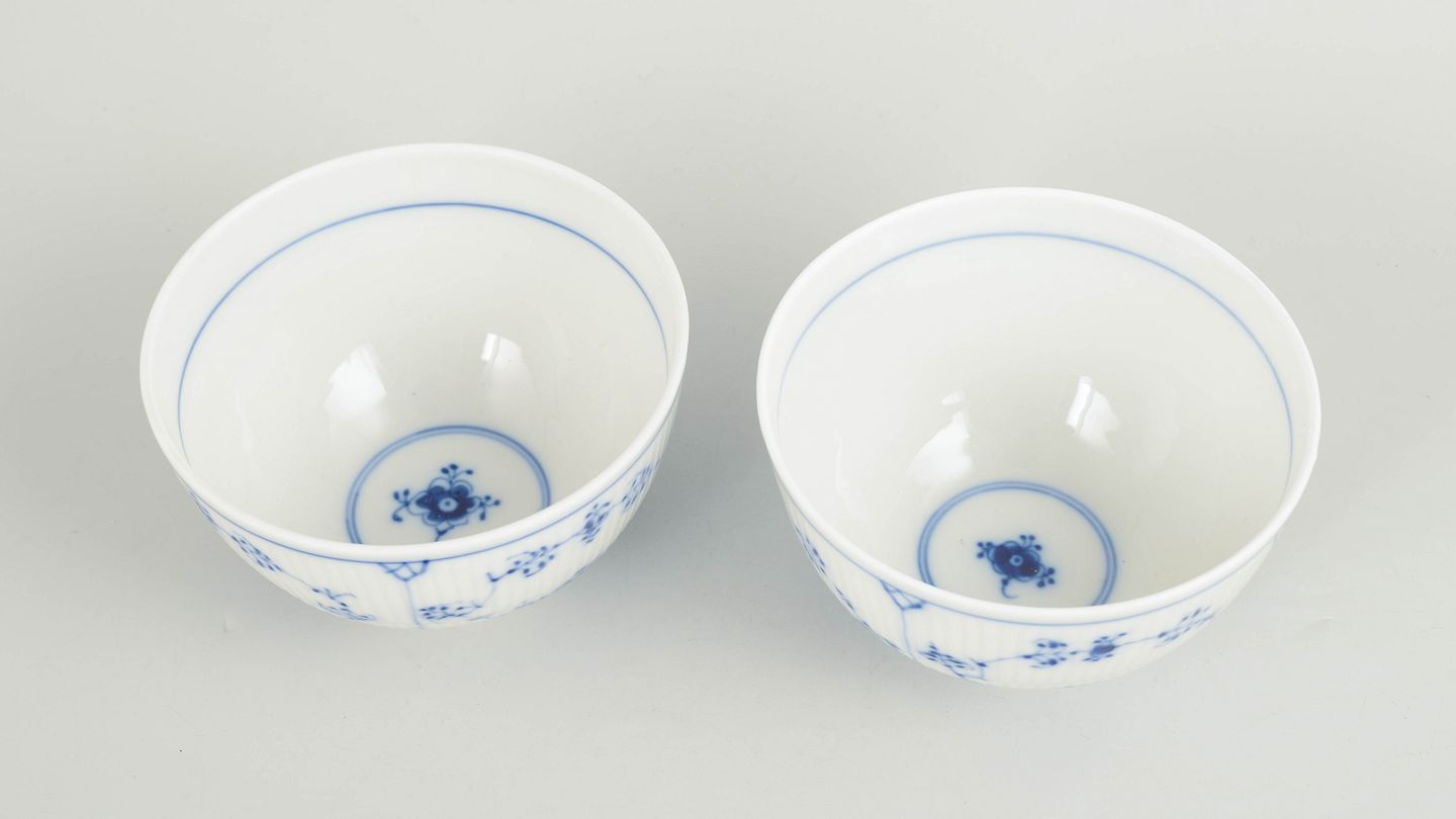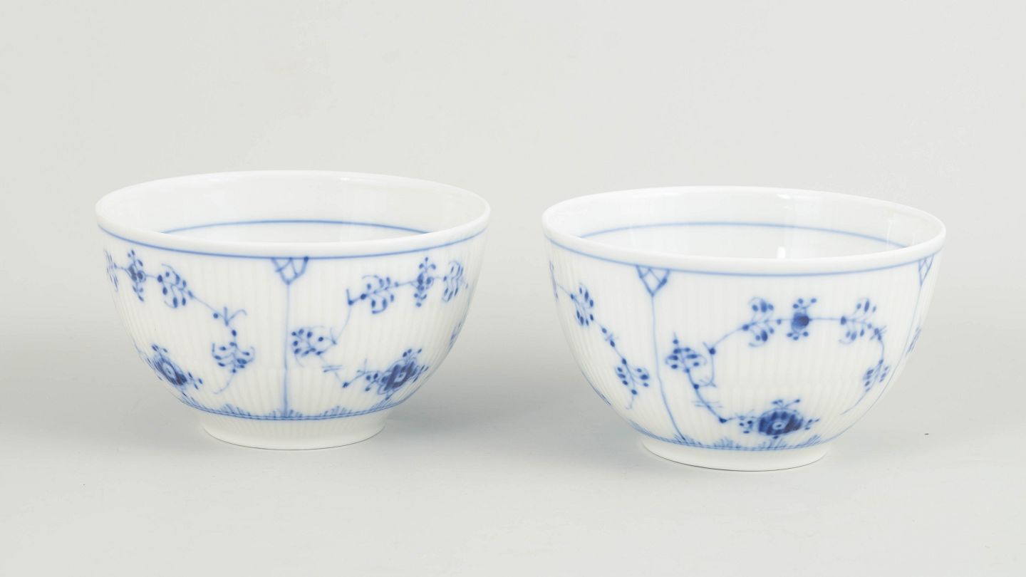 Sæt af to skåle i håndmalet porcelæn fra Musselmalet Riflet med klassisk underglasurdekoration i koboltblå og riflede felter. Model 1/209. H. 7 cm, D. 12 cm. Første sortering. Fremstillet i 1980’erne.